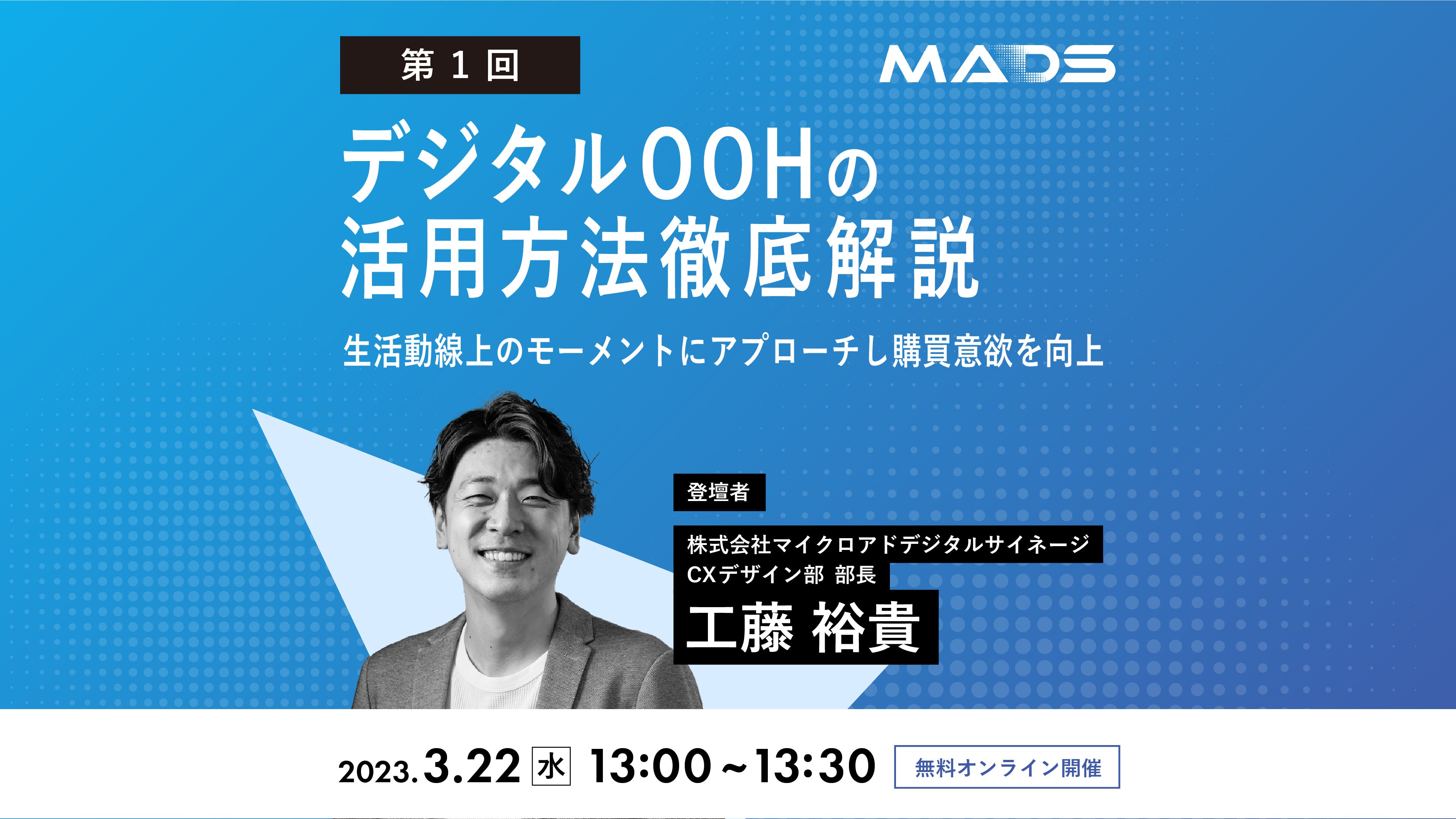 ドラッグストアにおけるデジタルOOHネットワークシェアNo.1(2022年度12月期自社調査|調査対象:指定領域における指定企業|調査方法:デスクリサーチ)のMADSは、ウェビナーを通じて、消費財メーカー企業を中心に、よりデジタルOOHの活用方法の解説を、基本的な内容を中心に、毎回トピックスを設けていく予定となります。