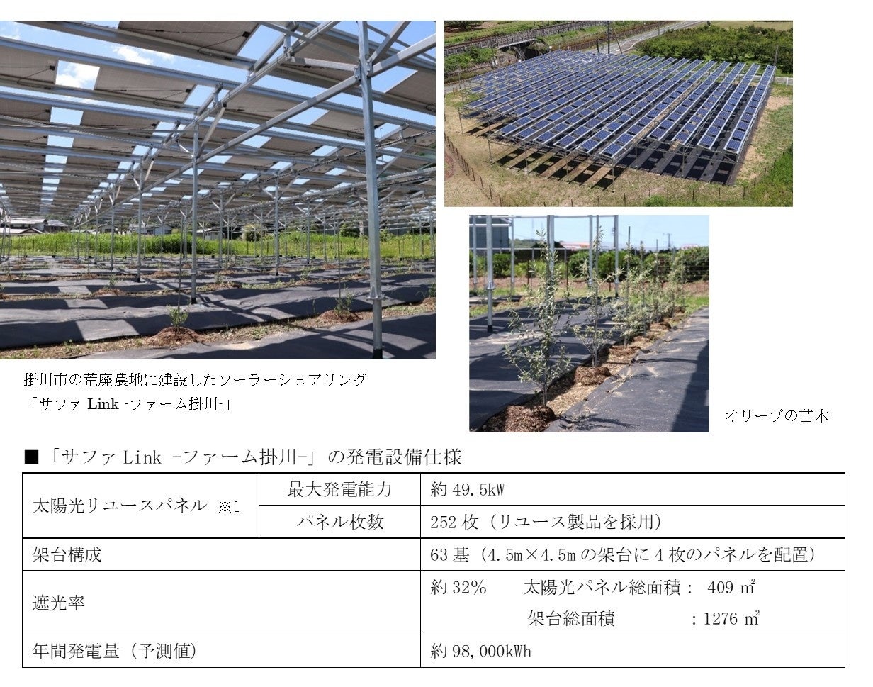 ソーラーシェアリング「サファLink -ファーム掛川-」は静岡県掛川市平野区にある荒廃農地1,685㎡に太陽光発電設備を設置。太陽光リユースパネルを使用し発電した電力をデジタルグリッド株式会社の電力取引プラットフォームを活用して環境価値を取得し、CO₂排出削減を行うとともに、耕作可