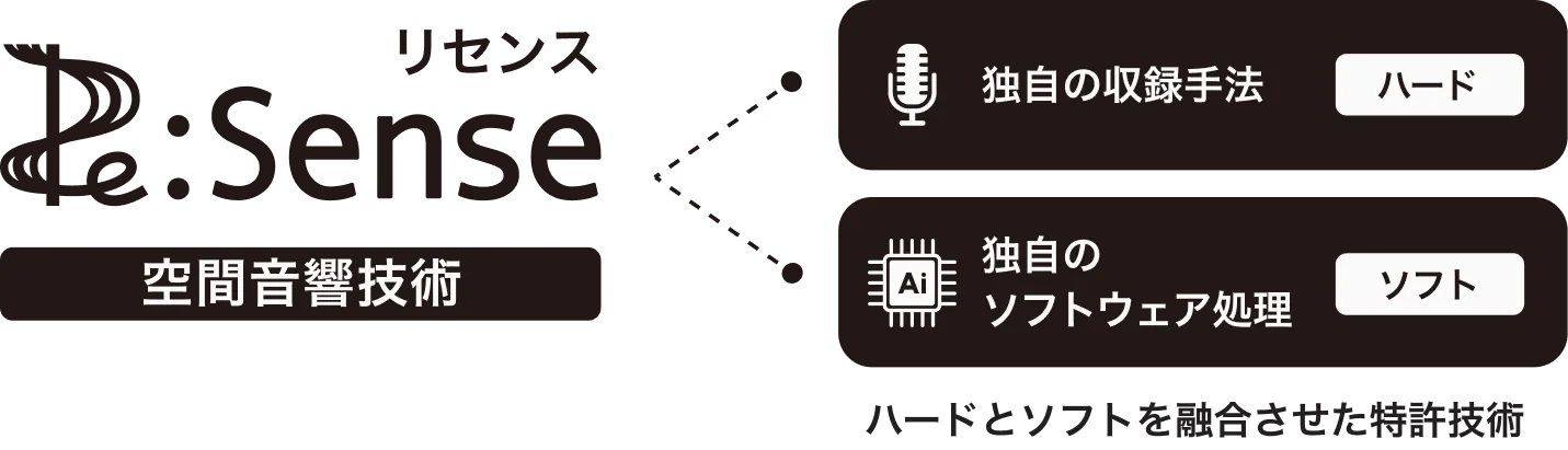 『Re:Sense™』*は、収録・編集手法、音響信号処理で今までにない音響体験を可能にします。独自の収録手法(ハード)と独自のソフトウェア処理(ソフト)を融合させた空間音響技術です。人の聴覚特性を精緻に把握することで、まるでその場にいるかのような圧倒的な空間再現性、リアリティ・生々しさ、気配感・息遣いを収録・再現しています。
