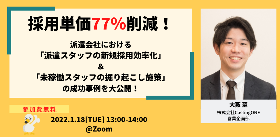 【無料ウェビナー】採用単価77%削減に成功!派遣会社様における派遣スタッフの新規採用の効率化、掘り起こし施策の成功事例を大公開!
