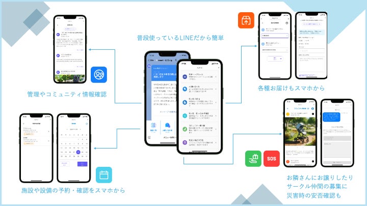 日常の管理に関するお知らせや、共用施設の予約などの日頃の利便性の向上、居住者間同士の交流やイベントの情報発信などができ、自助・互助・共助でお互いに支えるコミュニティづくりに資するよう、プロミライズ青葉台専用のLINEポータルを導入予定です。災害時には、必要な情報がより確実に届けられるような仕組みも構築します。
