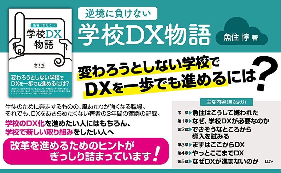 先生の仕事術に大きなインパクトを残した「教師のiPad仕事術」(魚住 惇 著)の刊行から3年。今度は学校でDXを進めるために奮闘した3年間をまとめた『逆境に負けない 学校DX物語』を刊行開始!