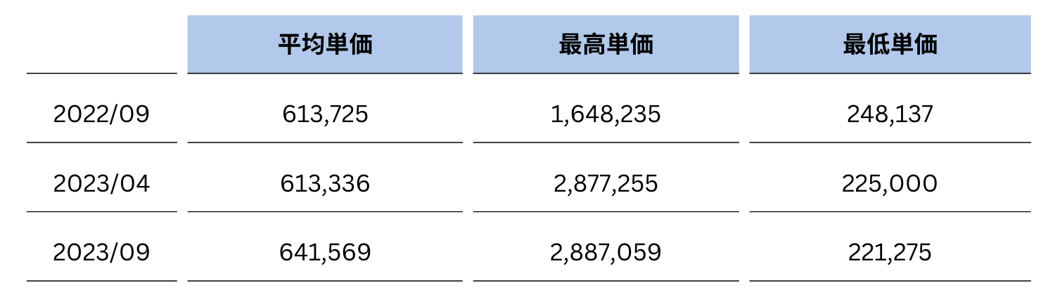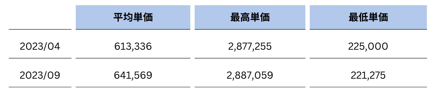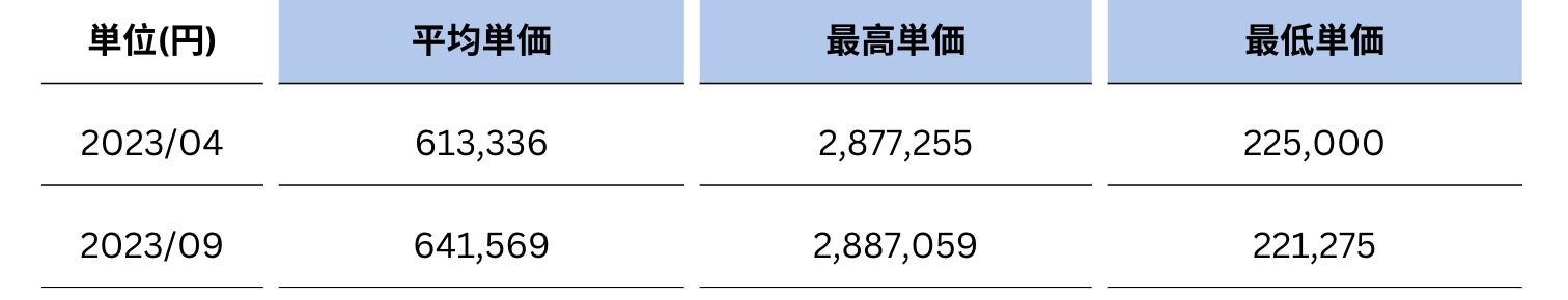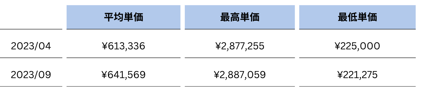 半年前の2023年4月時点の平均単価約61万円から、ゆるやかな上昇傾向が見られる結果となりました。