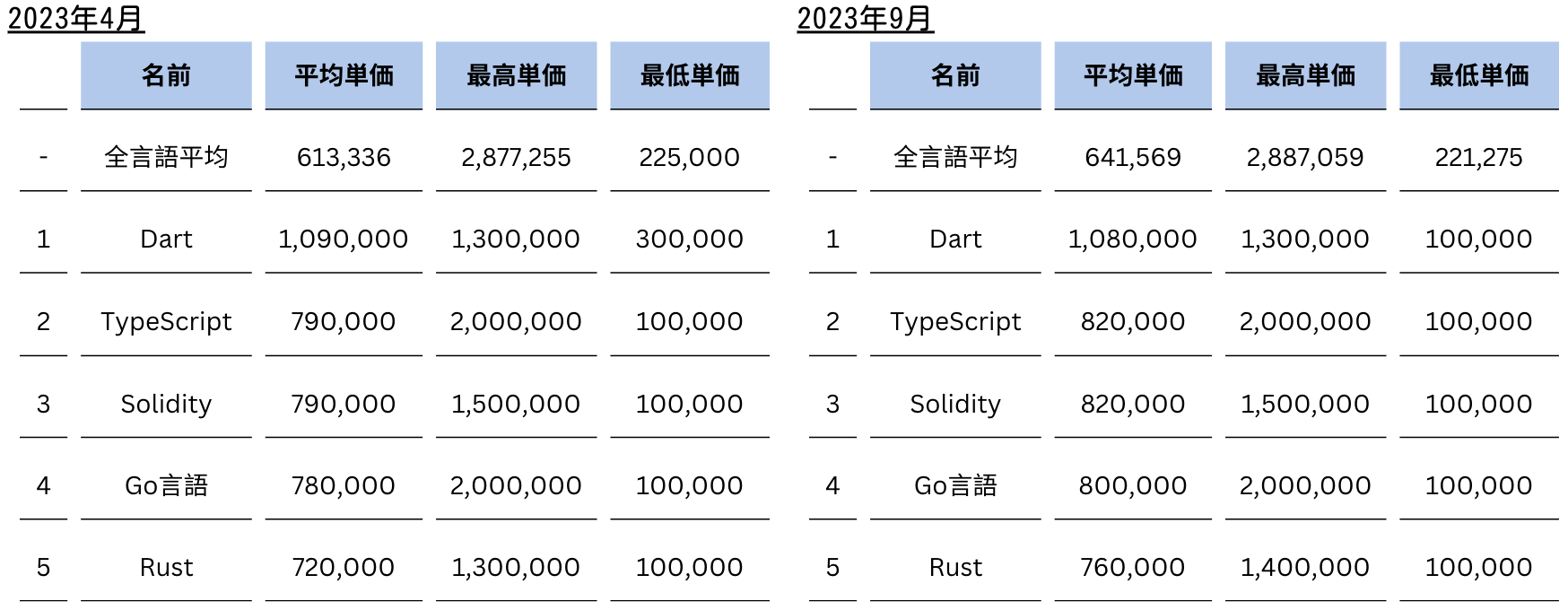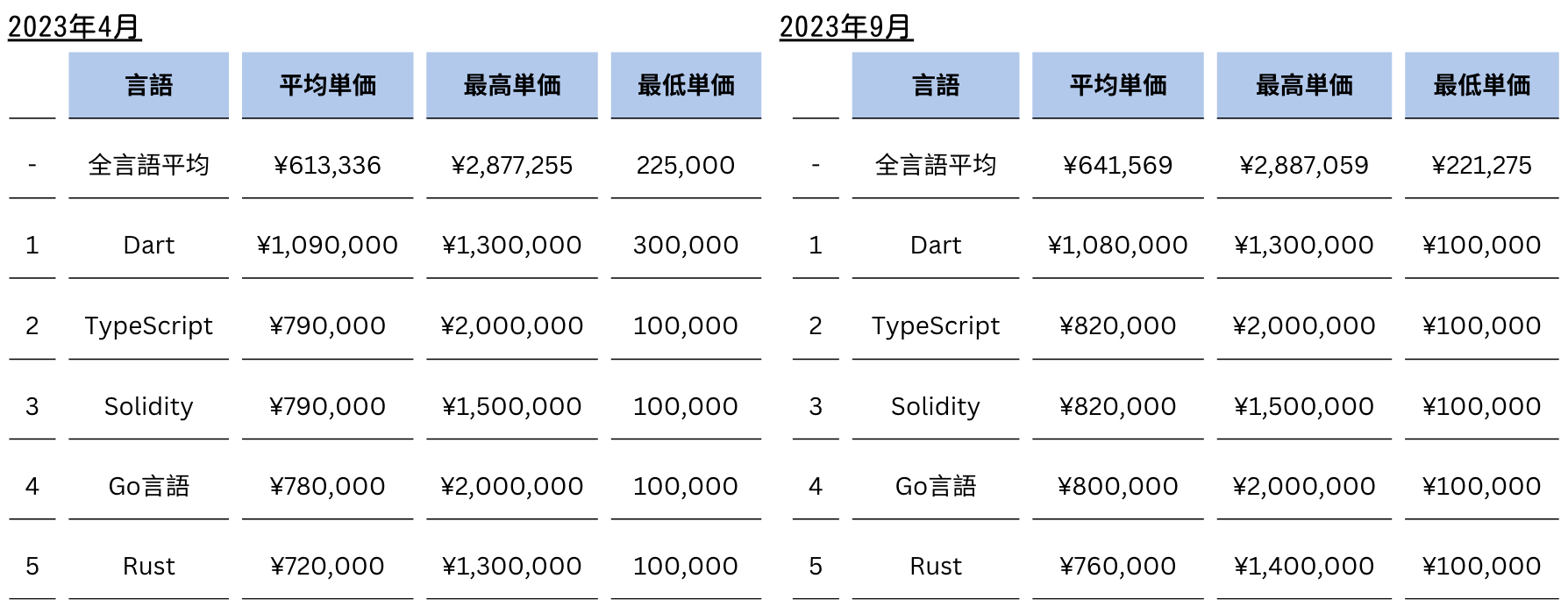 言語ごとの平均単価のランキングでは、2023年4月時点と比較し順位の変動がなかったものの、2位のTypeScriptと3位のSolidityは単価が30,000円増加しています。