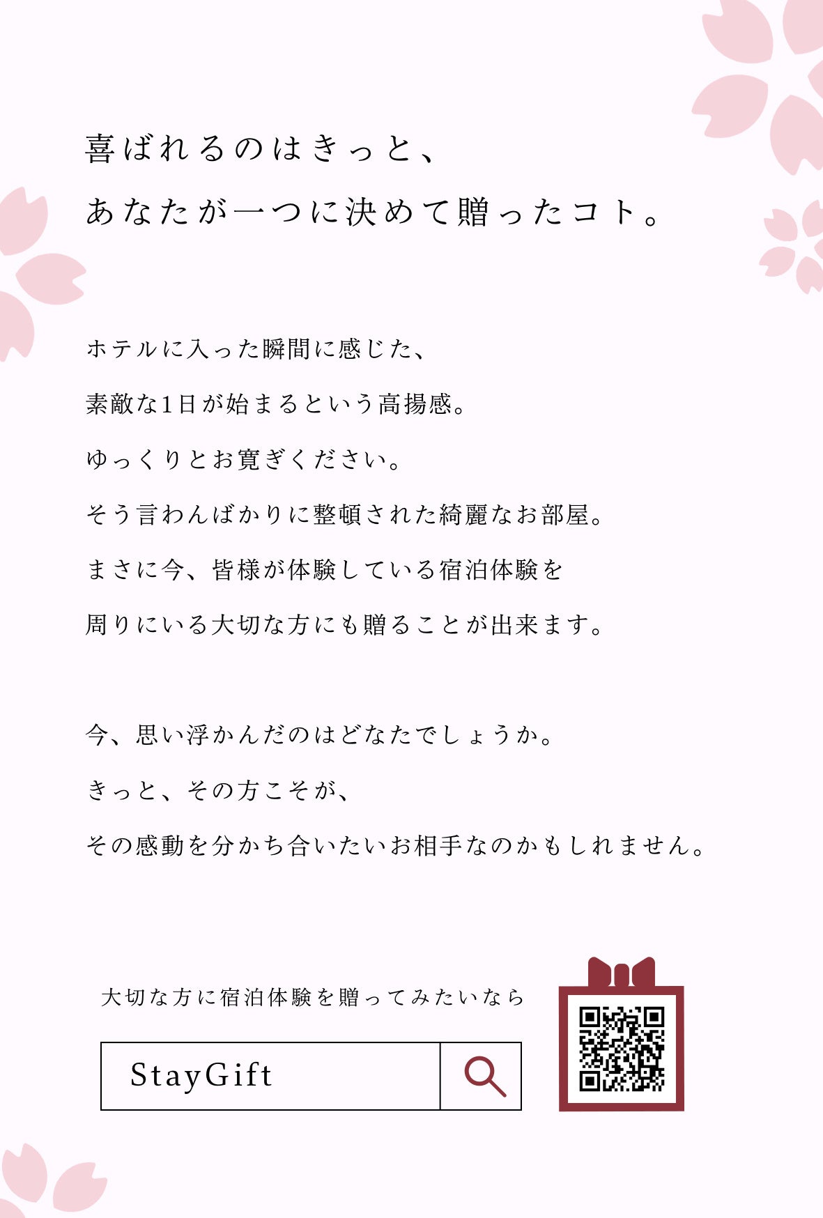 メッセージカードから、大切な人を思い浮かべてもらえるきっかけを創出し、宿泊施設のブランド価値を最も感じやすい宿泊時に、その体験を贈りたくなることを狙いにしています。これにより、宿泊を体験した方から未体験の方へと巡るような好循環を作って参ります。