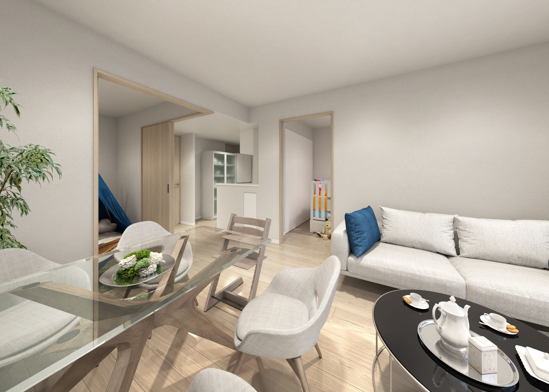 明るく開放的な南向き住戸を中心とした1LDK(1タイプ)・2LDK(3タイプ)で構成した全55戸の本建物は、1フロア4戸中3戸を角住戸で構成していることが特徴です。また、2LDK住戸は家族構成の変化、多様化する住まい方のニーズに対応するフレキシブルな利用が可能な間取りとしています。