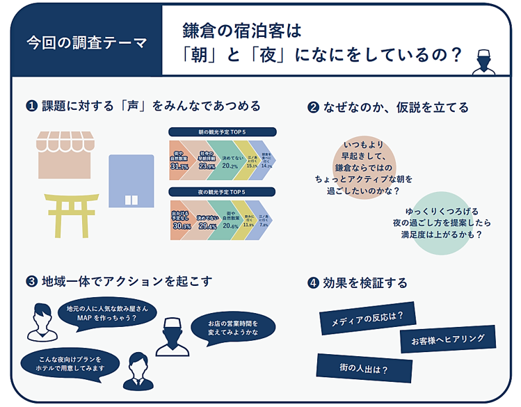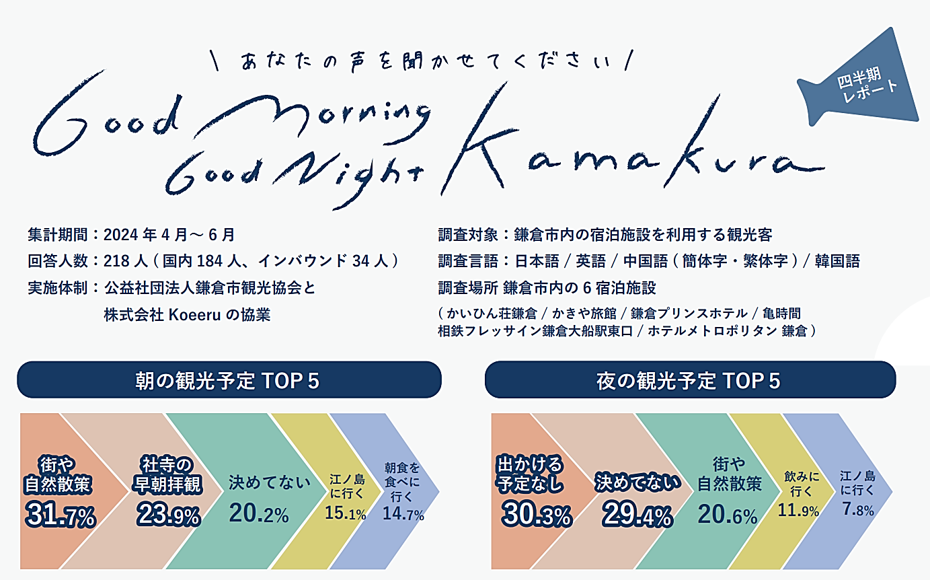 この取り組みは「鎌倉の夜と朝の観光」をテーマに、来訪目的や夕食場所、夜や朝にどのような観光をしているかなど、鎌倉に宿泊する観光客の声を市内宿泊事業者と連携して収集する地域共創CRM事業で、2024年4月より開始しました。