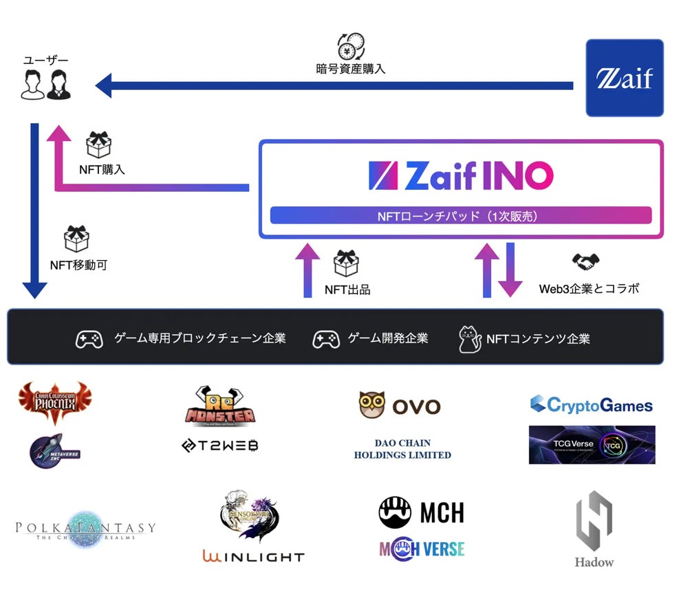 Zaif INO は NFTの一次販売に特化したNFT マーケットプレイスです。マルチチェーンに対応し、幅広いプロジェクトのNFT取り扱いを実現しました。また、GameFi初の審査制を導入し、ユーザーに向けクオリティーを担保したサービスや、参加プロジェクト側へは、事業拡大やスケールアップさせたいタイミングで活用できるサービスを提供しています。