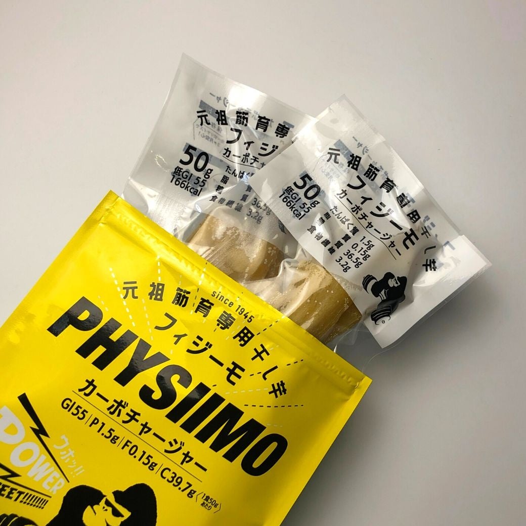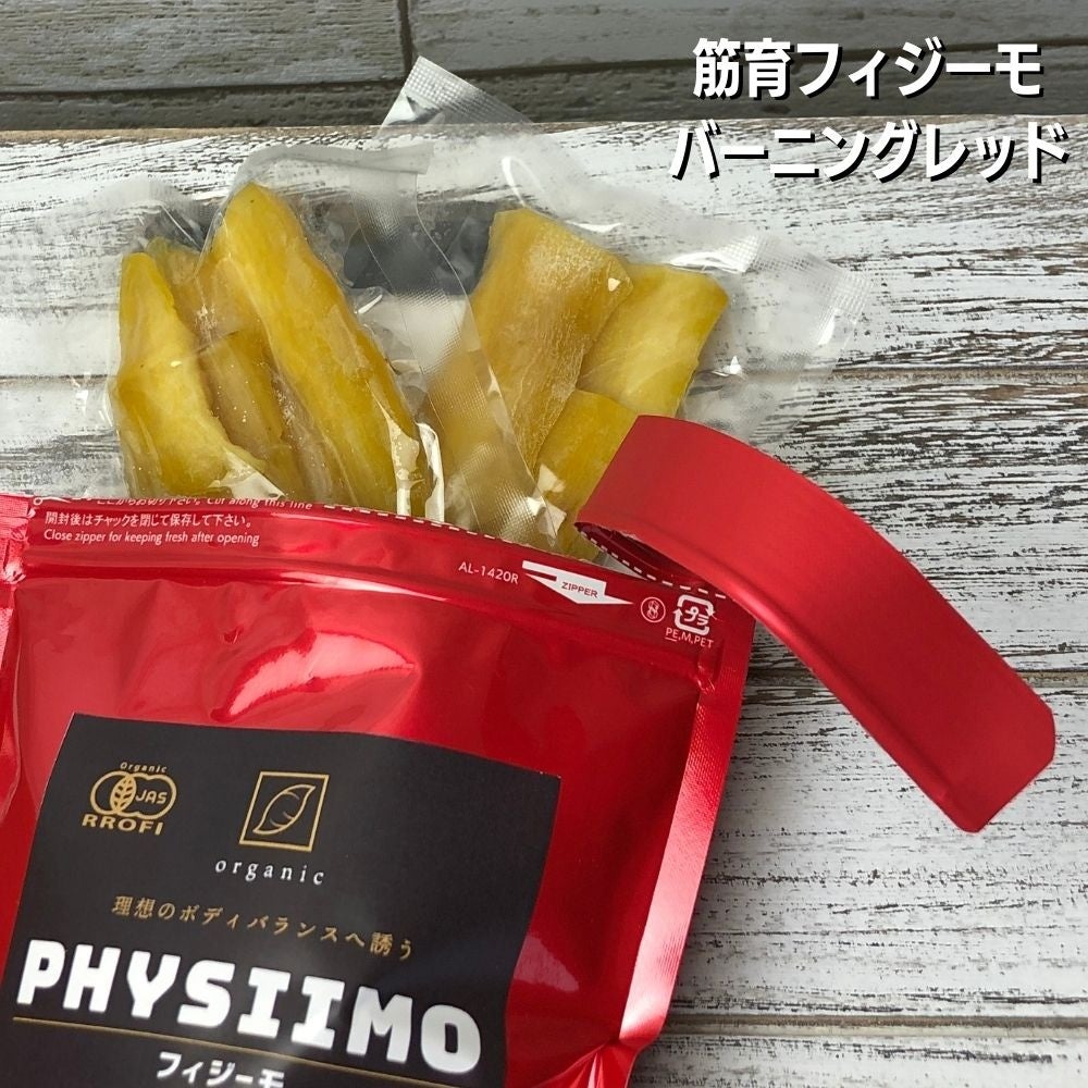 フィジークへの愛(I)とオーガニック干し芋への愛(I)を重ねて、フィジーク専用干し芋「PHYSIIMO(フィジーモ)」と命名しました。また、~PHYSICAL IMPROVEMENT MOTIVATION~肉体を鍛えぬく日々、傍にいつもフィジーモを置いて、癒し・やさしさといった温もりも感じていただき、心のエネルギーにしていただきたいという想いも込められています。