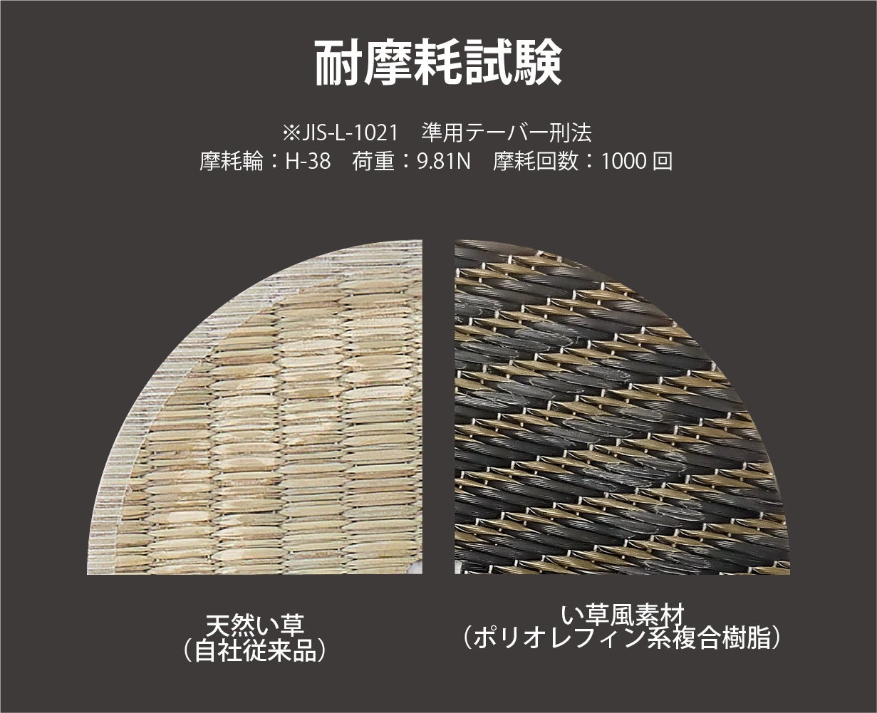 樹脂なので傷がつきにくく、ささくれが出来ないので手触りが滑らか。ペットがいる家庭にもおすすめです。第三者機関での耐摩耗試験において、1000回の摩耗後では、い草は色褪せ・ささくれが目立っているのに対し、PP素材(い草風素材)はわずかに傷が見られる程度です。