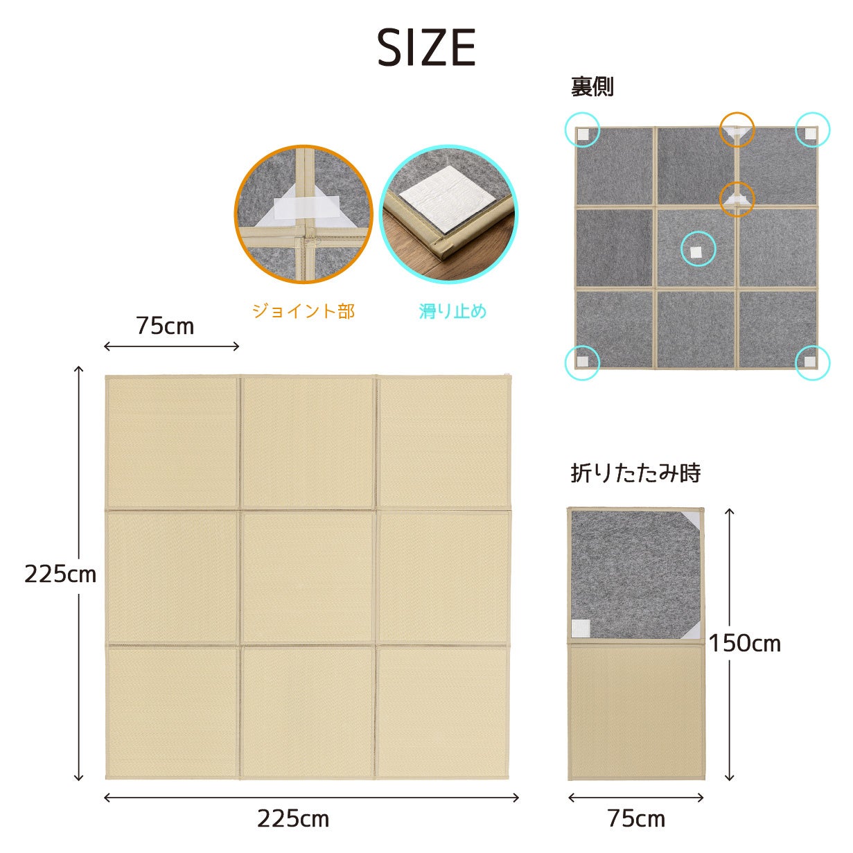 半畳サイズの畳を9枚縫い繋げたので、ズレる心配はありません。隙間も少ないので、ゴミも溜まりにくくなっています。ずれやすい掃除機掛けも繋がっているからズレずに楽々!すぐ折りたためるので、床の掃除や換気も簡単にできます。