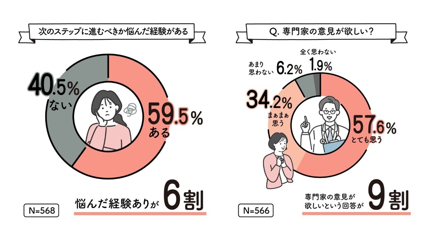 また約6割(59.5%)が妊活の際に、「次のステップに進むべきか悩んだ経験がある」と回答し、91.9%は「専門家の意見や診断が欲しい」と回答しています。