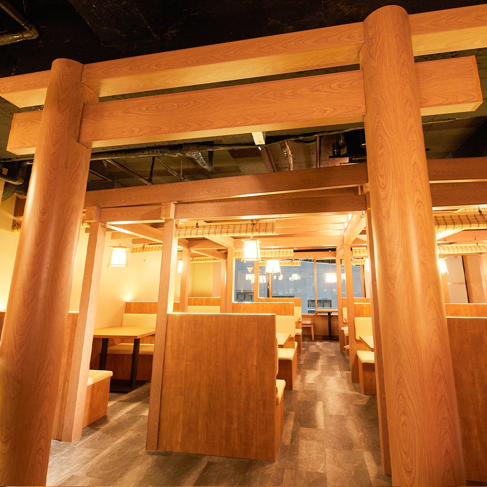 京出汁おでんと旬菜天ぷら 鳥居くぐりのカウンター席は、肩肘張らずに過ごせるカジュアルで心地よい空間。気兼ねなく、ご宴会やお食事をお楽しみいただけます。