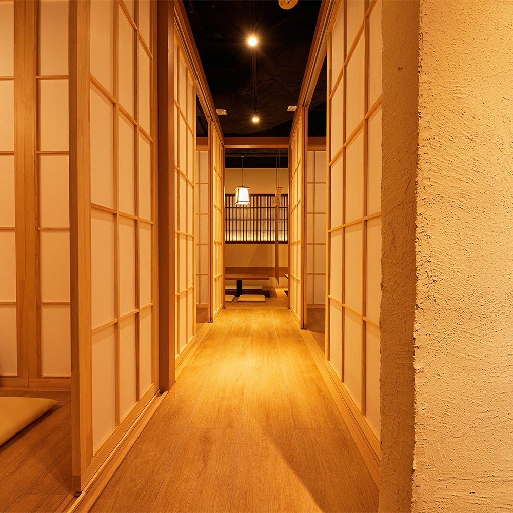 落ち着いた和モダン空間には、プライベートやご宴会に最適なお席をご用意しています。