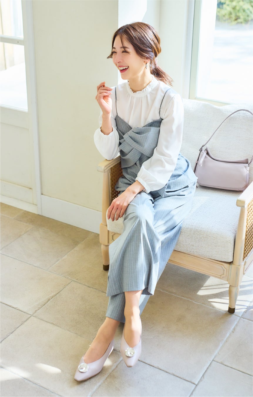 凹凸のあるメタルモチーフでこなれ感を演出。履き口のスッキリとしたVカットはフラットでもきちんと感のある印象に。シューズと同色のセットアップでリラクシーなオケージョンスタイルに!