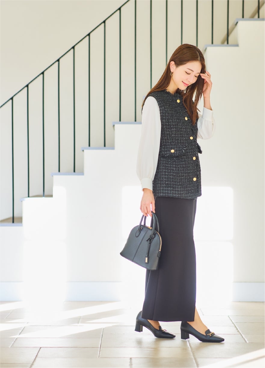 5cmのチャンキーヒールで、安定感ときちんと感を両立。ツイードジレとペンシルスカートに小さめのブガッティ型バッグを合わせ、洗練されたレディスタイルに♪