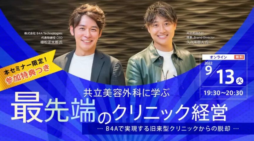 医療法⼈社団美⼈会(本社所在地:東京都渋⾕区、理事⻑:久次⽶秋⼈)が経営管理する共⽴美容外科(以下「共⽴美容外科」)は、自由診察クリニック特化のワンストップ型DXツール「B4A」を手掛ける株式会社B4A Technologies(以下「B4A社」)と共に、医科・歯科医師のための自費診療や医院経営、セミナー情報がみつかる会員サービス「自費研」にて『最先端のクリニック経営』をテーマにしたウェビナーを9月13日(火)に実施します。