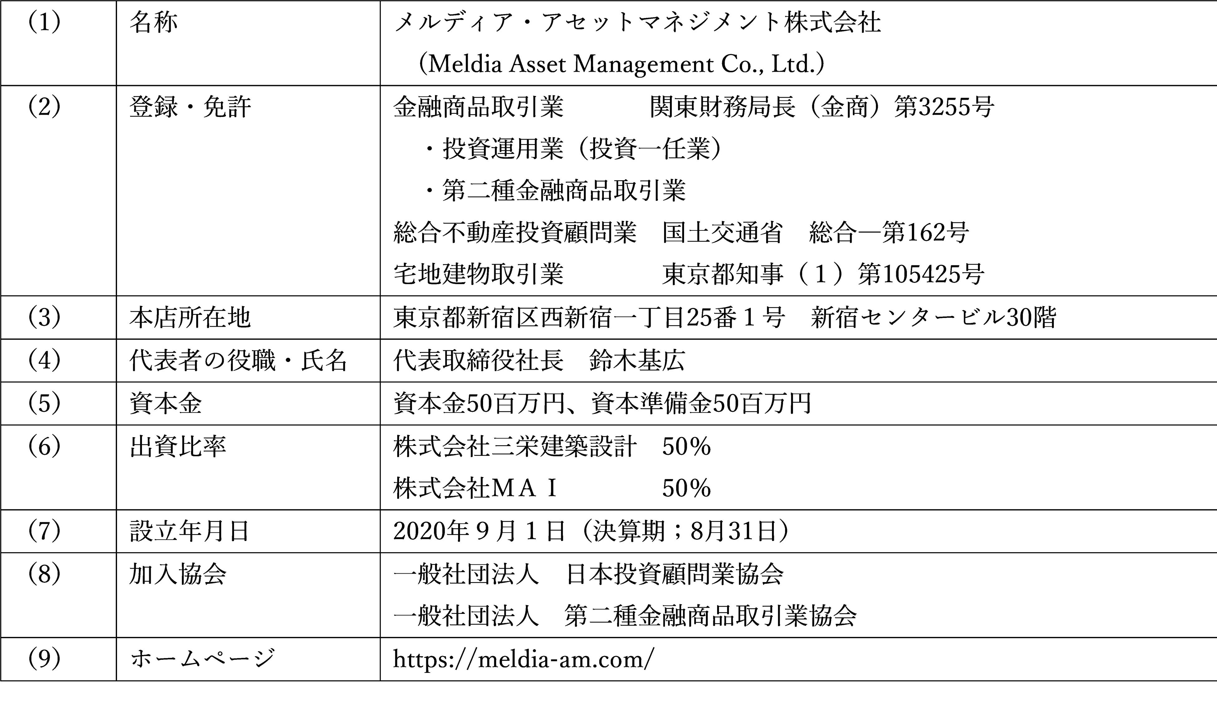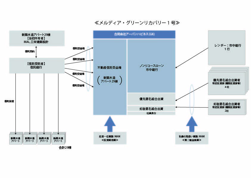 今般、当社が設計・建築し、その全額出資子会社である株式会社MAI(以下「MAI」という。)及び当社が保有する新築木造アパート、国産木材を使用した棟を含めて、合計29棟を投資対象としてMAMが不動産ファンド「メルディア・グリーンリカバリー1号」を組成し、本日付で運用を開始しましたので、下記の通りお知らせいたします。