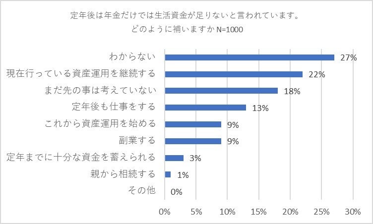 それでは定年後についてはどのように考えているのでしょうか。「定年後は年金だけでは生活資金が足りないと言われています。どのように補いますか」と尋ねたところ、「わからない」が27パーセントで最多。以下、「現在、行っている運用を継続する」(22パーセント)、「まだ先の事は考えていない」(18パーセント)、「定年後も仕事をする」(13パーセント)の順となりました。「わからない」と「まだ先の事は考えていない」の合計が半数近くの45パーセントに上りました。男女別では「現在、行っている運用を継続する」が男性では28パーセントでトップだったのに対し、女性は16パーセントで第3位と違いが見られました。
