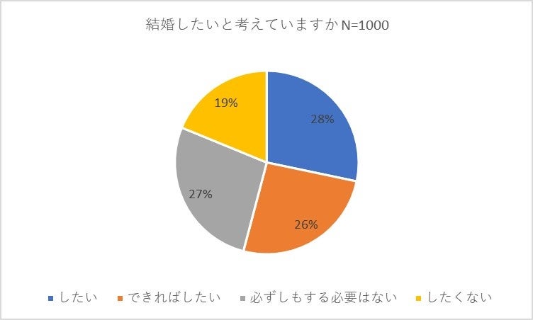 ライフステージの最初の大きな節目である結婚について尋ねました。「結婚したいと考えていますか」と質問したところ「したい」との回答が28パーセントでトップでした。以下、「必ずしもする必要はない」(27パーセント)、「できればしたい」(26パーセント)、「したくない」(19パーセント)が続きました。「したい」と「できればしたい」の合計は54パーセントで「必ずしもする必要はない」と「したくない」の合計46パーセントを若干上回りました。男女別では「必ずしもする必要はない」と「したくない」の合計は男性が48パーセント、女性は44パーセントでともに5割近くに上り、男女ともに結婚に対する意欲の低さが明らかになりました。