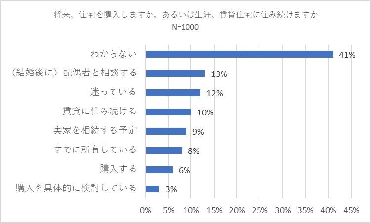 次に結婚とともにライフステージの重要な節目である住宅購入について「将来、住宅を購入しますか。あるいは生涯、賃貸住宅に住み続けますか」との質問を行いました。結果は「わからない」との回答が41パーセントで突出して1位でした。以下、「(結婚後に)配偶者と相談する」(13パーセント)、「迷っている」(12パーセント)、「賃貸に住み続ける」(10パーセント)が続きました。住宅購入は結婚とも密接な関係がありますが、現在独身である事や結婚への意欲が低い割合が多いこともあり、住宅の選択に関して現実感を持つことができないのかもしれません。