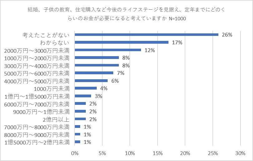 人生にはそれぞれの節目での大きな出費を含め多くのお金が必要になります。「結婚、子供の教育、住宅購入など今後のライフステージを見据え、定年までにどのくらいのお金が必要になると考えていますか」と質問したところ、「考えたことがない」が26パーセントで最多となり、「わからない」が17パーセントで続きました。以下は「2,000万円~3,000万円未満」(12パーセント)、「1,000万円~2,000万円未満」、「3,000万円~4,000万円未満」(ともに8パーセント)と10パーセント前後で具体的な数値での回答が入りました。「考えたことがない」と「わからない」を合わせた43パーセントの方々が具体的な金額をイメージできていないことがわかりました。