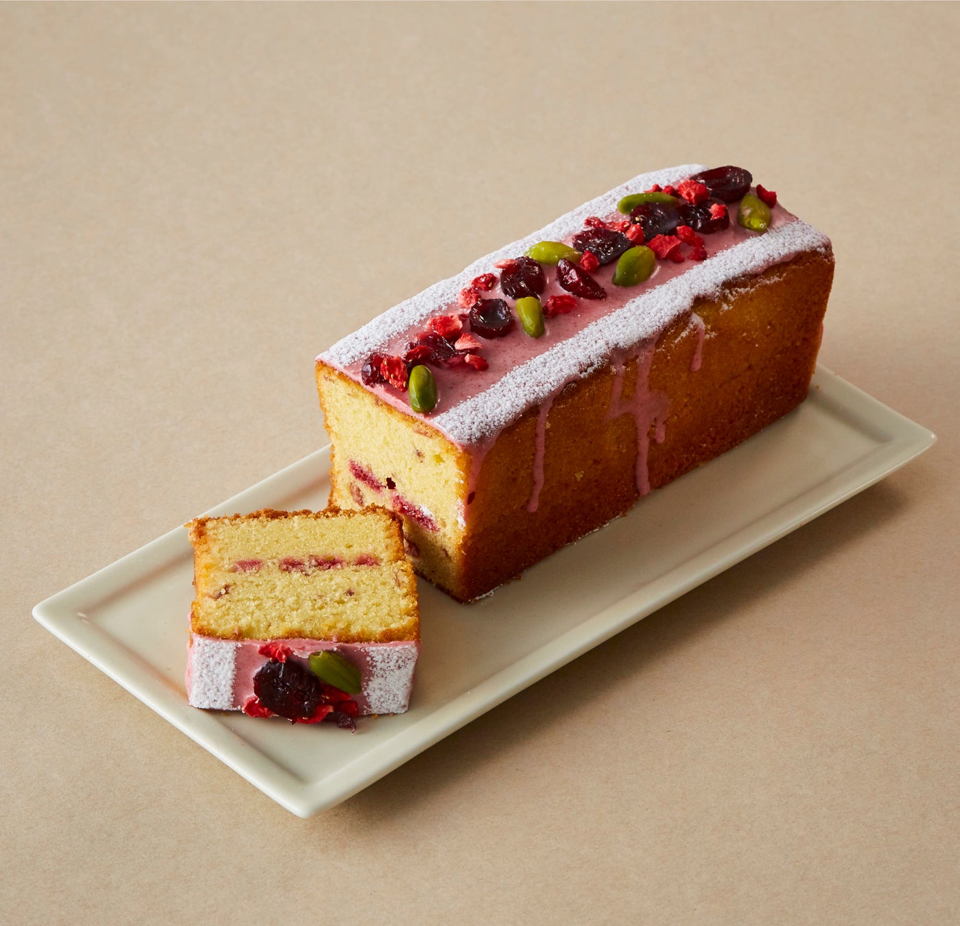 アーモンドとピスタチオが香る濃厚なケーキに、甘酸っぱい自家製フランボワーズジャムをサンドしました。