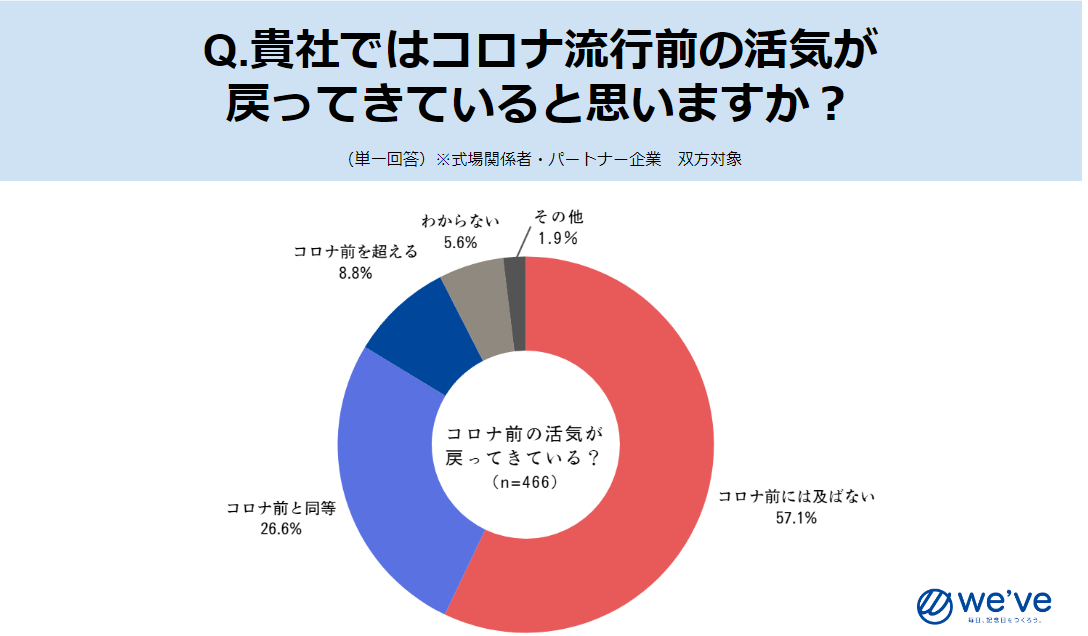 業界全体のコロナ流行後の厳しい現状を裏付ける結果となりました。コロナ前の活気には及ばないと回答したのは、全体で57.1%。コロナ前を超えると回答した方は、わずか8.8%。コロナ前にようやく戻りつつあるものの、成長への道のりはまだ遠い状況と言えます。
