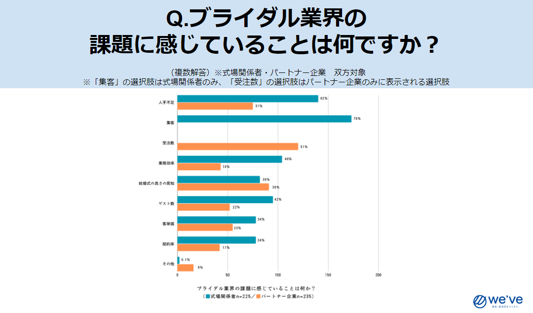 式場関係者では、「集客(76%)」が最も多く、次いで「人手不足(62%)」「業務効率(46%)」が続きました。パートナー企業等では、「受注数(51%)」「結婚式の良さの周知(38%)」「人手不足(31%)」が上位の回答になりました。