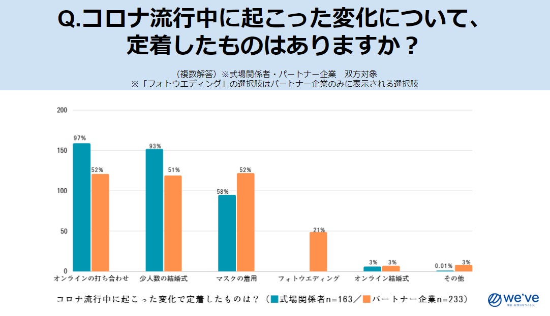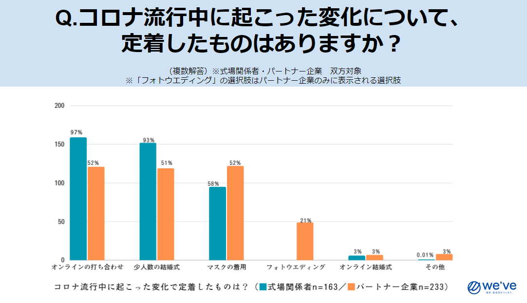 オンライン打ち合わせ(式場関係者97%、パートナー企業52%)と並んで、少人数の結婚式(式場関係者93%、パートナー企業51%)が多く、他業界同様に、感染リスクの減少はもとより、移動時間の短縮など関係者全員に大きなメリットがあったことで、一定層ではアフターコロナでも日常的に利用されるようになっています。