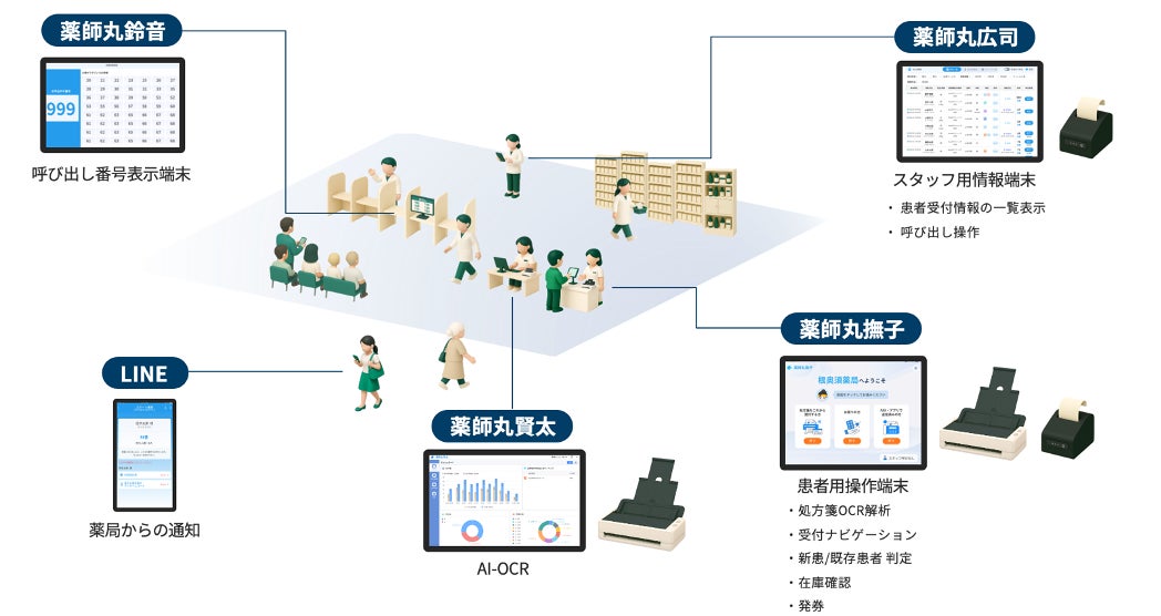 スマート薬局は、受付業務を起点に、薬局における各種業務の効率化・省人化と、患者サービスの質的向上を同時に実現する次世代型の薬局業務支援ソリューションです。