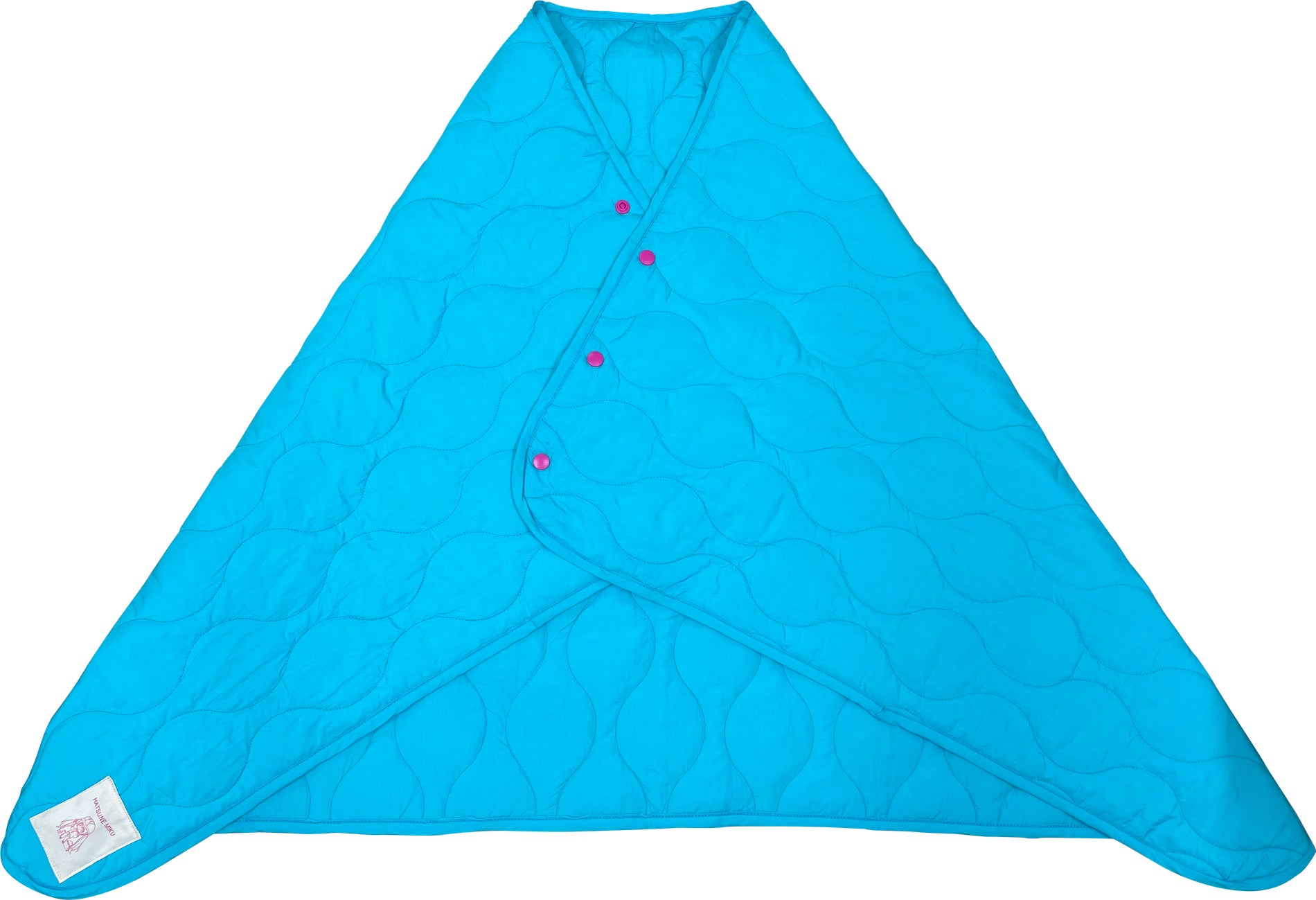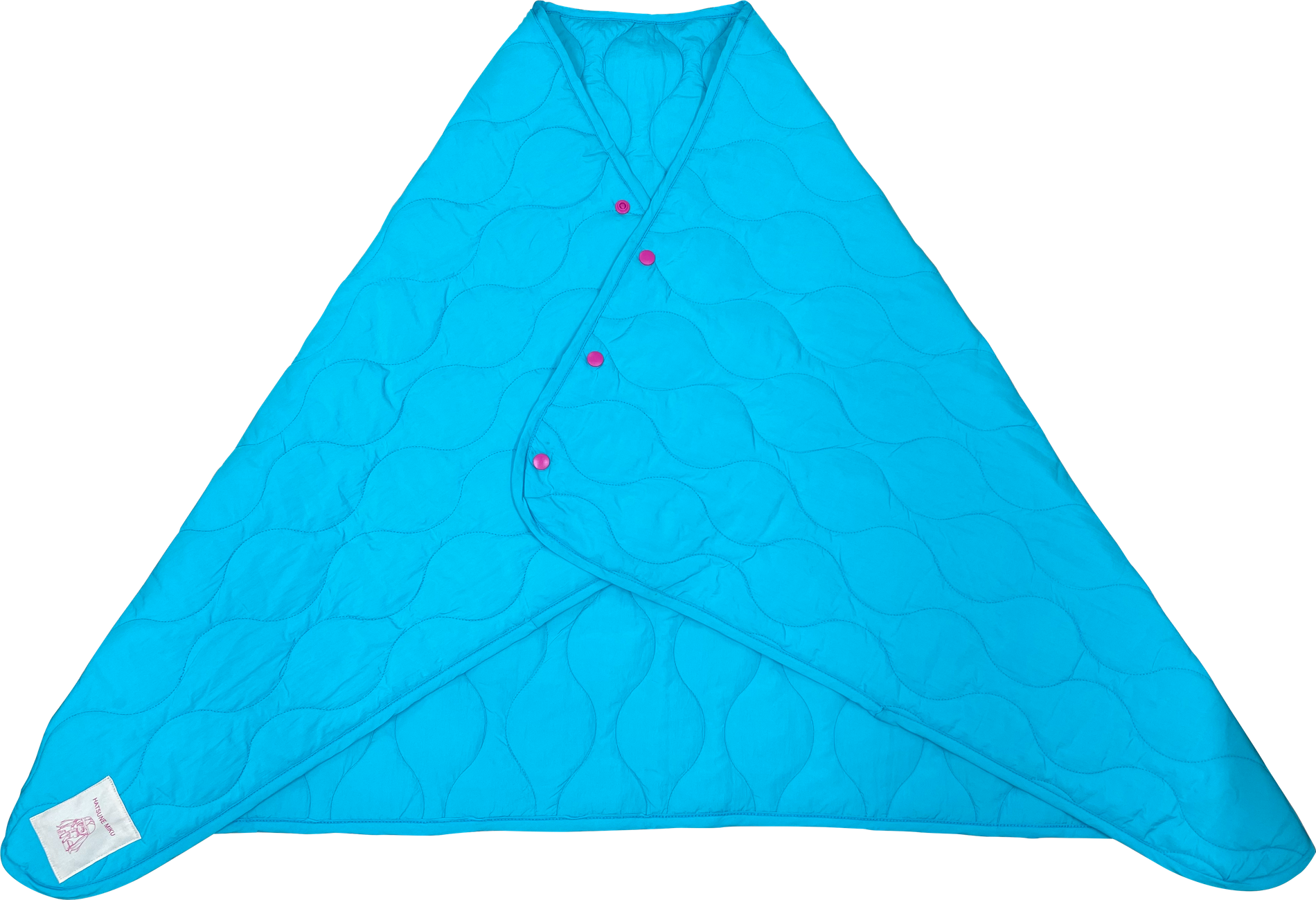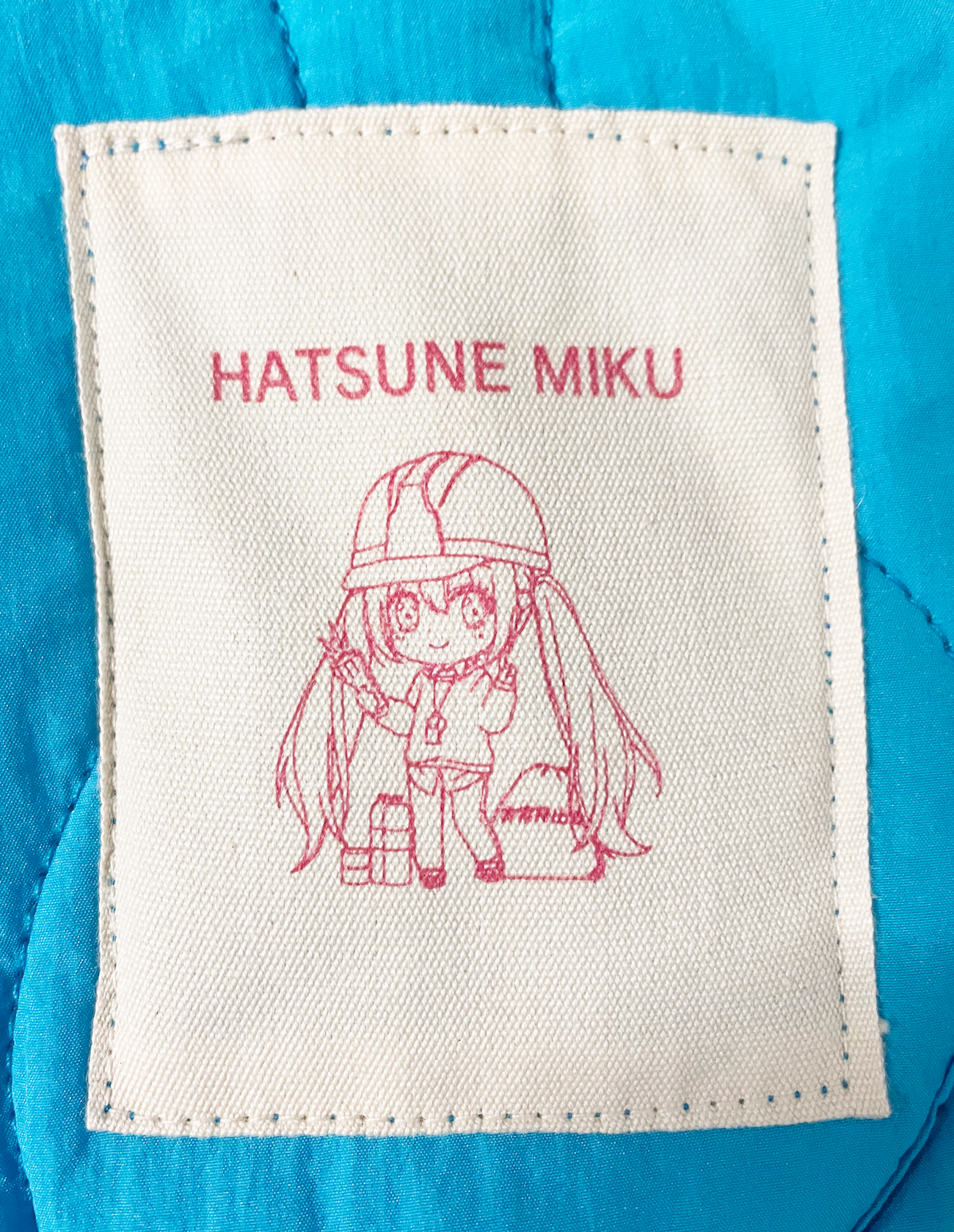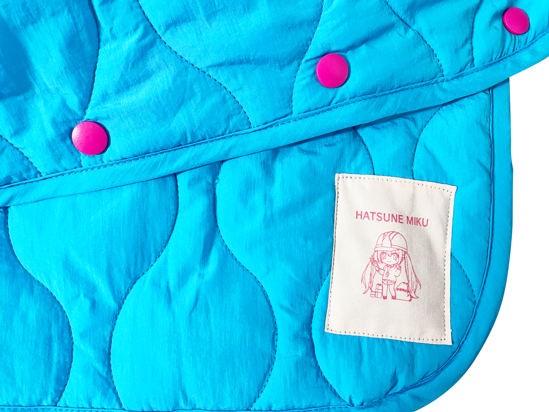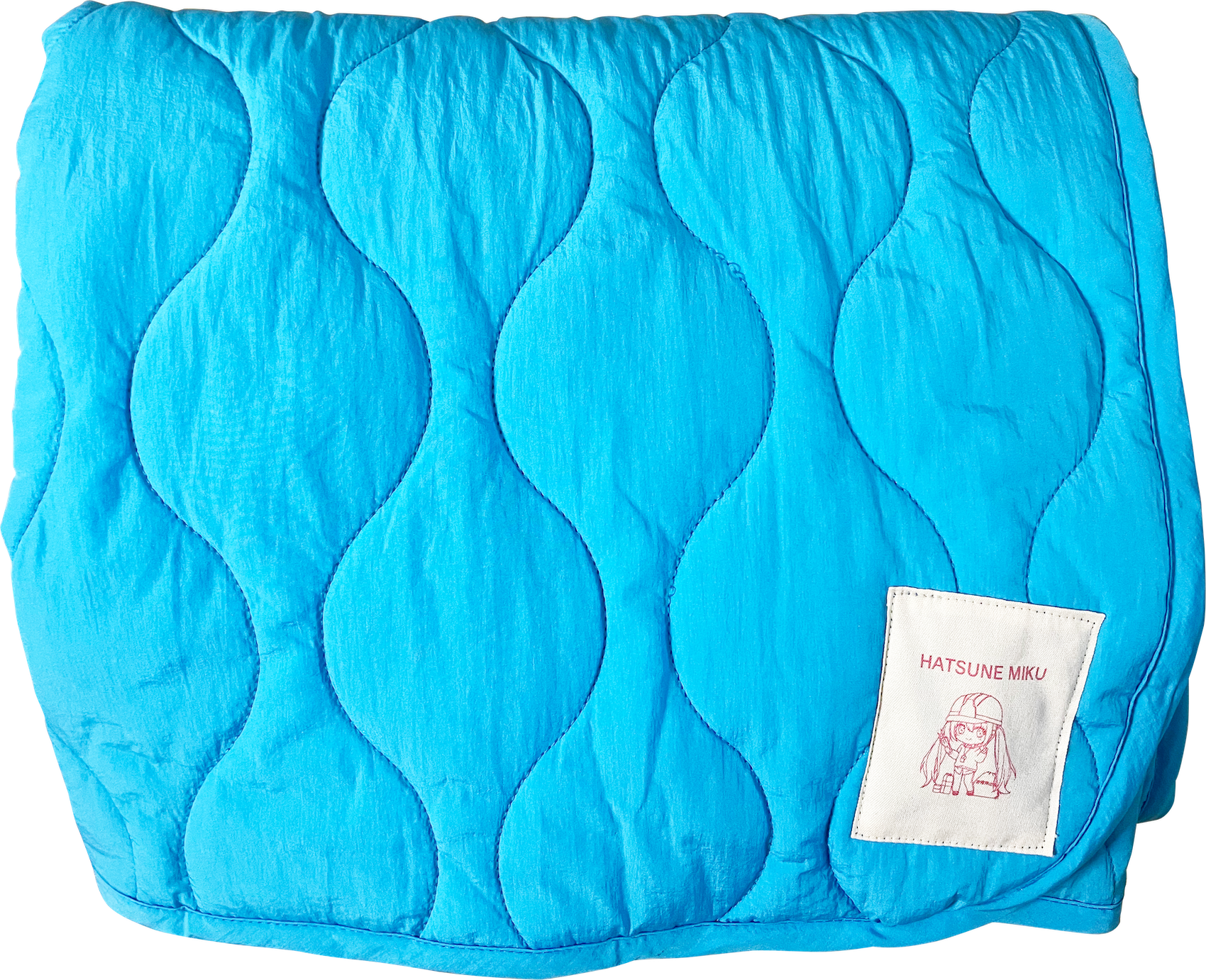 初音ミクのイメージカラーであるブルーグリーンの軽量ナイロンの表生地に、保温性のある中綿を入れたブランケットです。