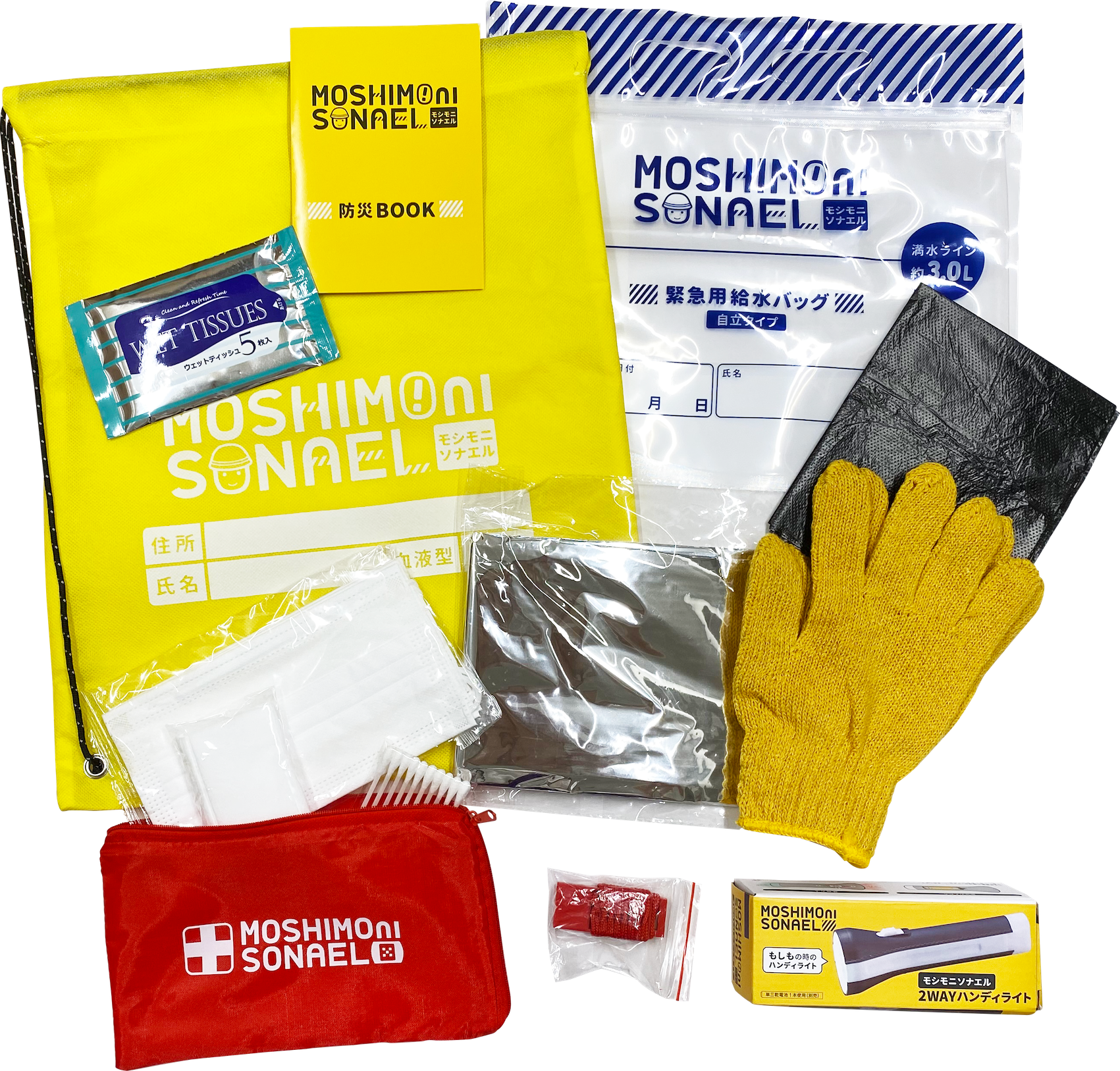 防災グッズは、避難時や断水時などにご活用いただける13点セットとなっております。