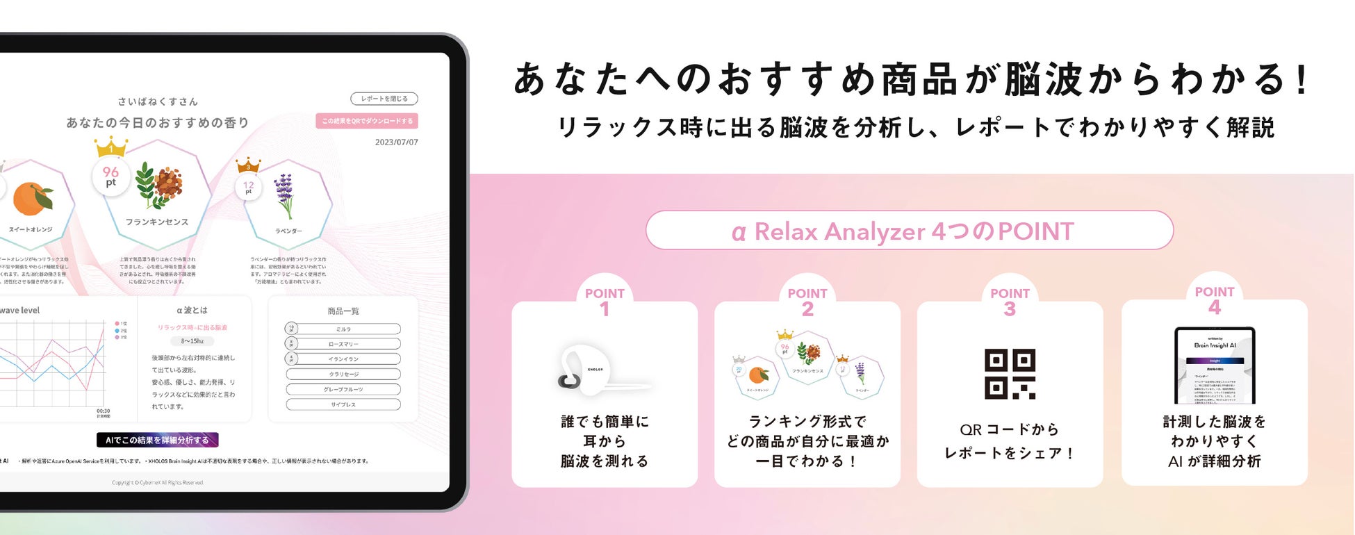『α Relax Analyzer』は、リラックスと癒しをもたらす様々な商品やサービスの効果を定量的に評価し、直感的に理解できる形で表示する斬新なアプリケーションです。このサービスにより、お客様一人ひとりのライフスタイルに適した商品やサービスを提案し、より質の高いリラクゼーション体験を可能にします。