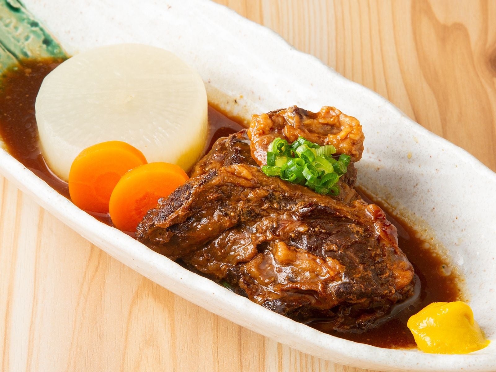6時間煮込むことにより、肉は柔らかジューシー軟骨までトロっトロ♪味噌仕立て超濃厚。付け合わせのお野菜と一緒にどうぞ。