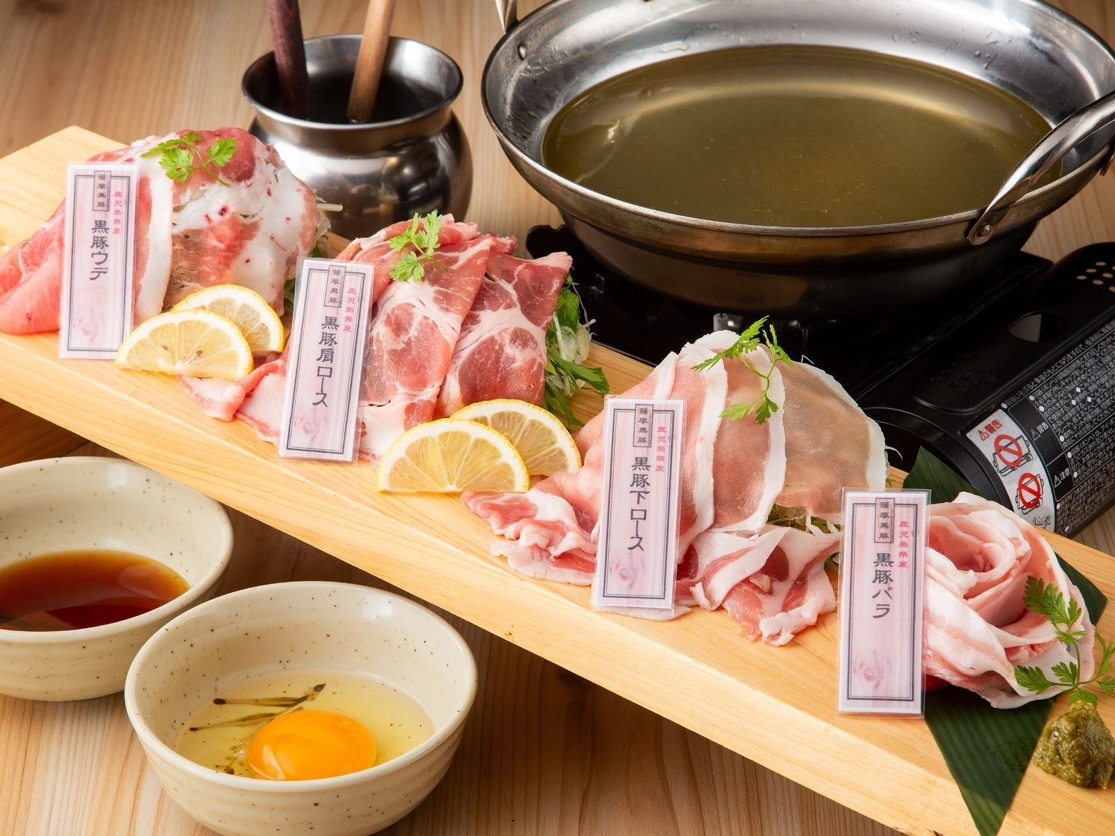 黒豚はバラ、下ロース、肩ロース、ウデの4種類のお肉を味わえます。お出汁は自家製鶏出汁を使用。鹿児島でも珍しいしゃぶしゃぶの提供いたします。