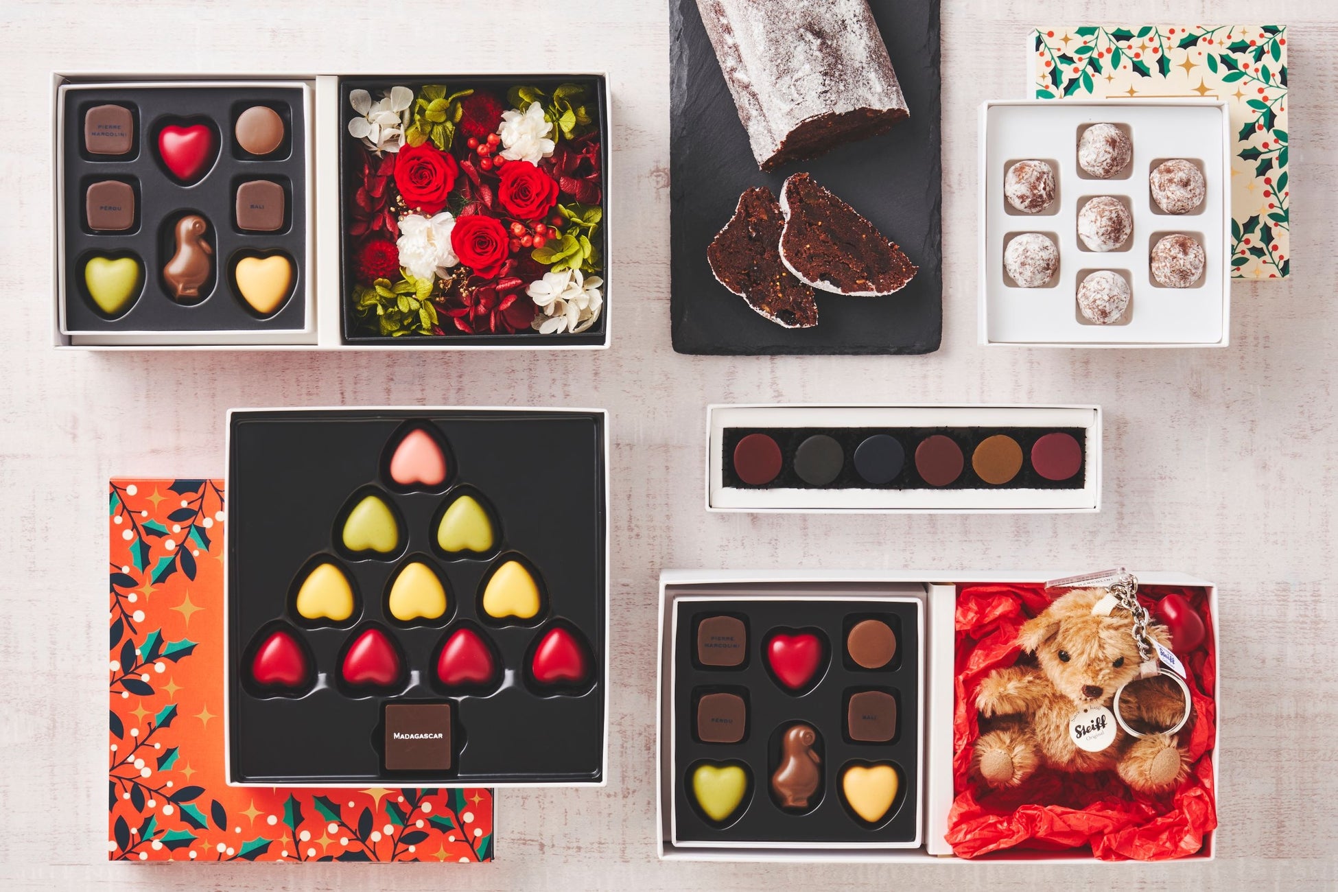 11月15日(火)に発売となるのは、ハート型の’クール シリーズ’を華やかに詰め合わせた「クリスマス コレクション 12個入り」「トリュフ シャンパーニュ 7個入り」「シュトーレン」のほか、ハードリカーとショコラのマリアージュを楽しめる新アソート「レア ウィスキー&ラム 6個入り」、シュタイフの可愛いミニテディが入った特別限定品など6アイテム。クリスマスプレゼントとして、大切な方へのホリデーシーズンの贈り物にも相応しいラインナップです。いずれも数に限りがありますので、お早めにお求めください。