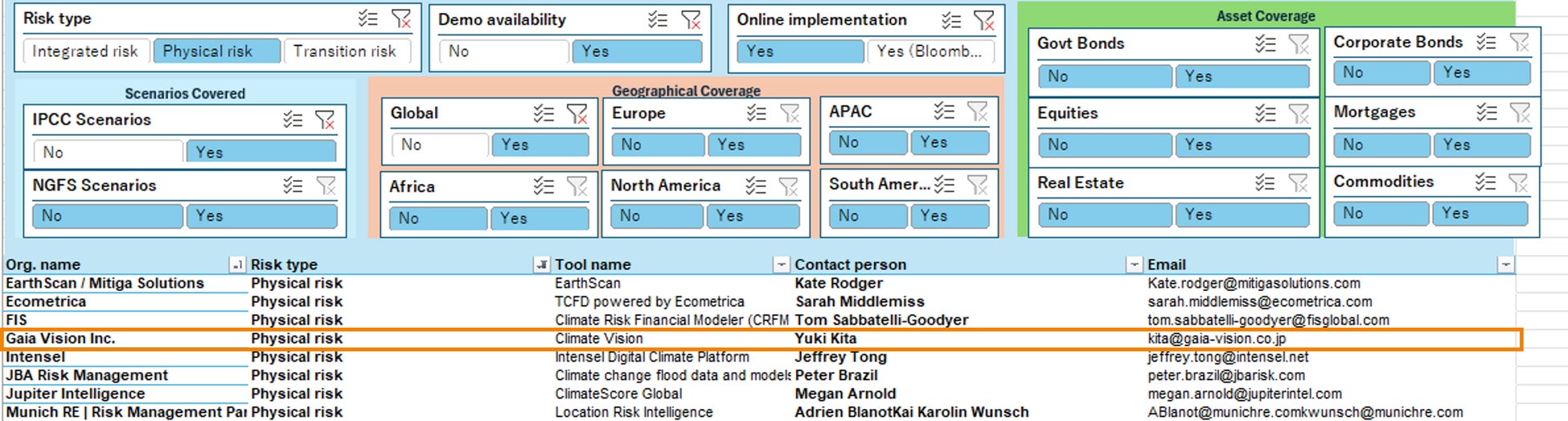 株式会社Gaia Vision(本社:東京都渋谷区神宮前六丁目23番4号桑野ビル2階、代表取締役:北 祐樹)は、当社の気候変動リスク分析プラットフォーム「Climate Vision」が、国連環境計画・金融イニシアティブ(UNEP FI)が運営する気候リスクツールデータベース「The Climate Risk Tool Dashboard」に掲載されたことをお知らせいたします。