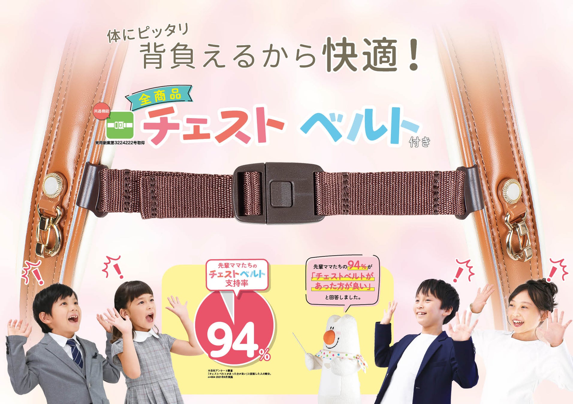 重たい荷物を持ち運ぶには、肩ひもが、肩にやさしくしっかりとフィットするだけでなく、体の動きとのズレを少なくすることがポイントです。ふわりぃランドセルはランドセルの両肩ひもをつなぐ「チェストベルト」を全てのモデルに標準装備することで、背負いやすさも格段にアップしました。