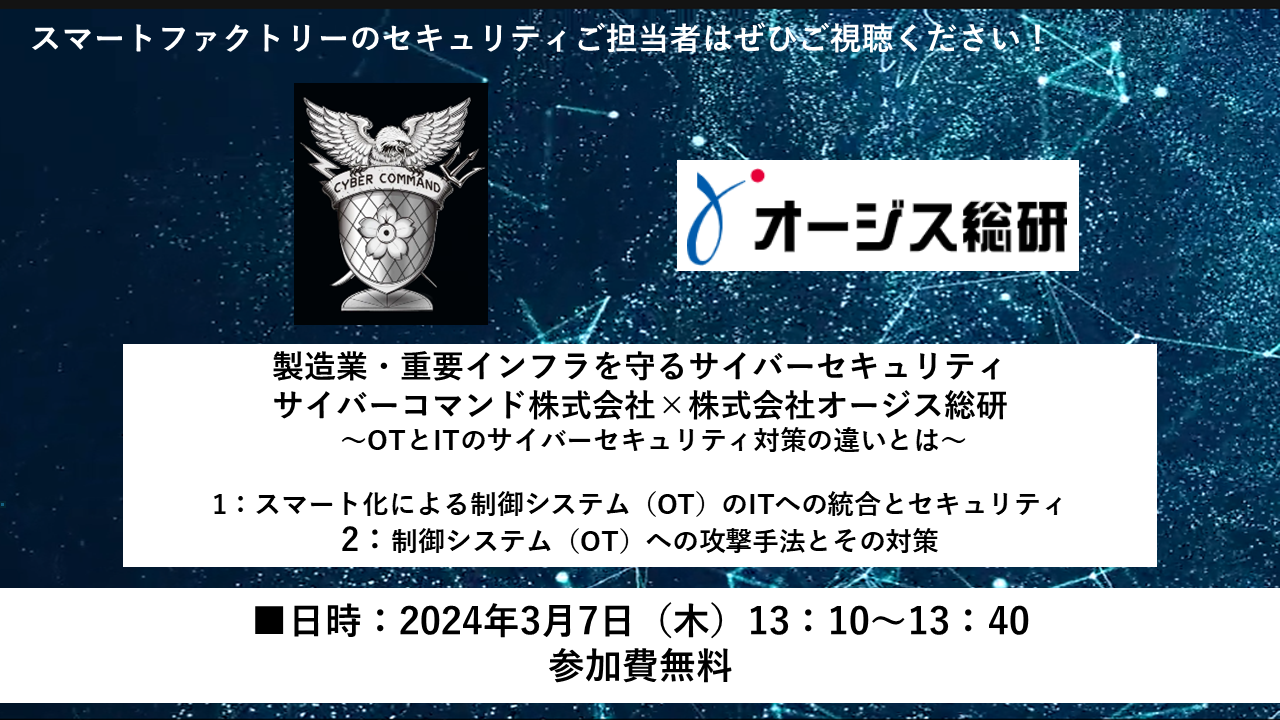 サイバーコマンド、3月7日にオージス総研と製造業のサイバーセキュリティについて共催ウェビナー開催予定