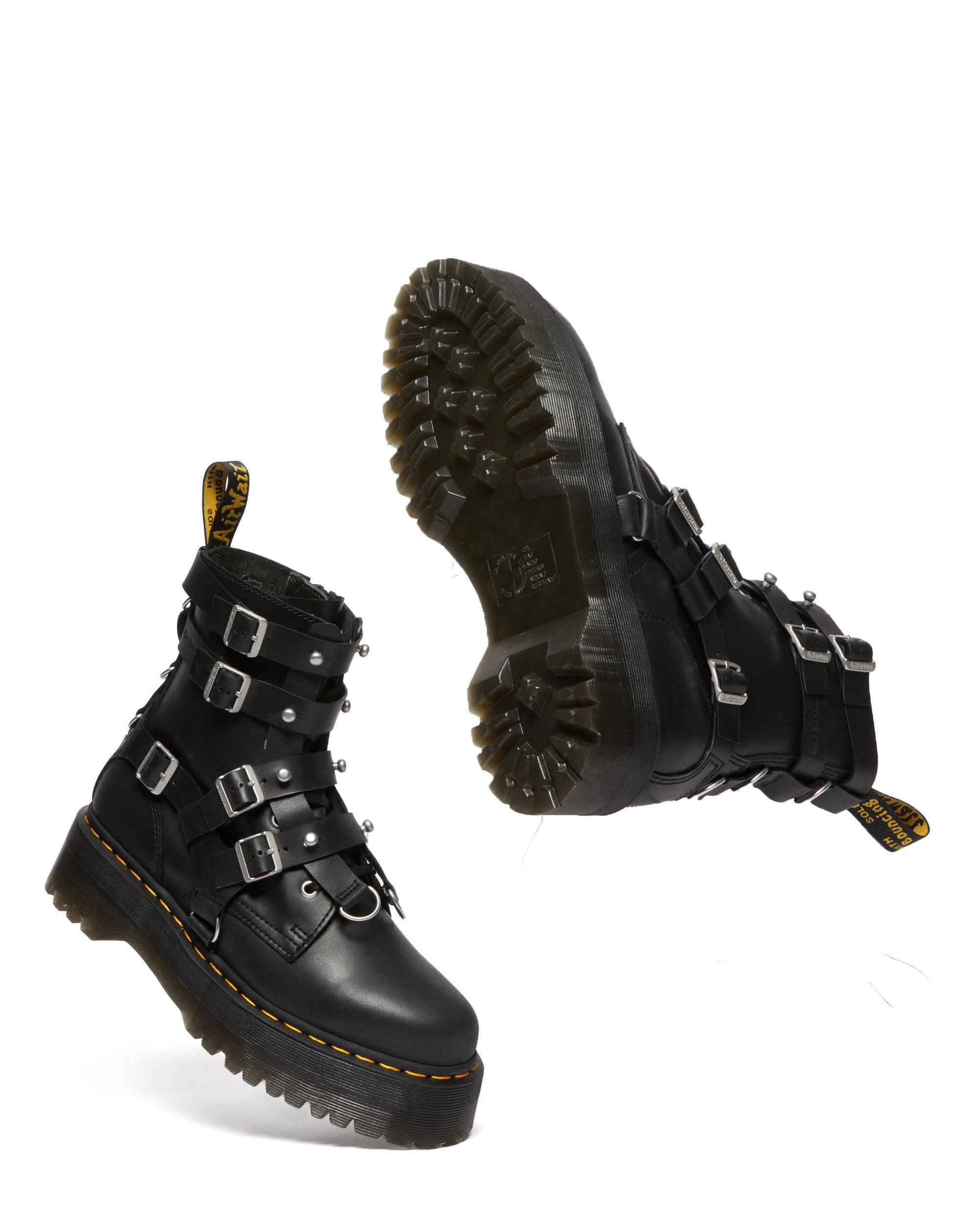「JADON TGF」ブーツは、異端児やミュージシャンに人気の厚底モデルJADONプラットフォームブーツのシルエットを基にブラックオイリーイリュージョンレザーアッパーと型押しがされたハーネスがハードで印象的なデザイン。ブラッシュドシルバーのバックルとスタッズ、ジッパーに採用したカスタムクロスボーンの引き手などディティールにも拘ったインパクト抜群なブーツとなっています。「1460 TGF」ブーツは、1460 8ホールブーツのアイコニックなシルエットに、ブラックオイリーイリュージョンレザーのしなやかな質感とブラッシュドシルバーのアイレットやクロスボーンチャームのコントラストがアクセントとなっており、ブーツの外側に施されたTHE GREAT FROGの型押し加工がスタイリッシュな一足となっています。いずれのスタイルもドクターマーチンのDNAであるアイコニックなウェルトステッチとヒールループで仕上げられています。