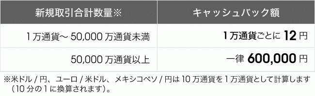 新規取引合計数量が500万通貨⇒6,000円キャッシュバック