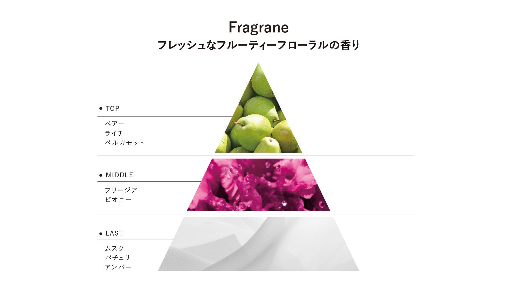 フレッシュなペアーとライチの透明感に、心地よくやわらかなピオニーとアンバーの余韻。