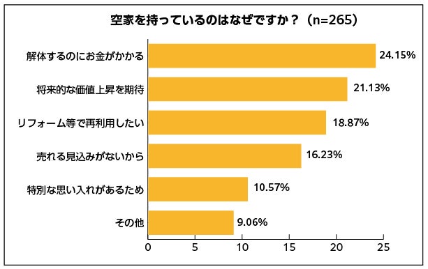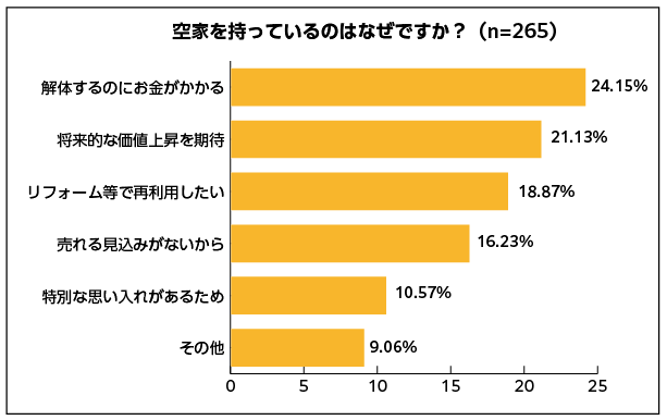 ・なぜそのままにしているかの理由、第一位は「解体するのにお金がかかる」、第二位は「将来的な価値上昇を期待」