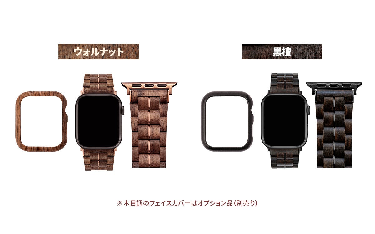 オプションでApple Watch本体を保護する木目調のポリカーボネート製フェイスカバーも用意しました。ベルトと組み合わせて使用すれば、Apple Watchが木製の腕時計になったような一体感をもたらします。