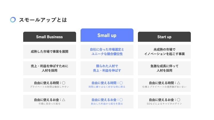Small up企業とは、エクイティでの調達をせず自己資本で、自社に合った市場選定とユニークな競合優位性を築き、限られた人材で売上・利益を上げる「小さなチームで大きな仕事をする会社」のことを指します。