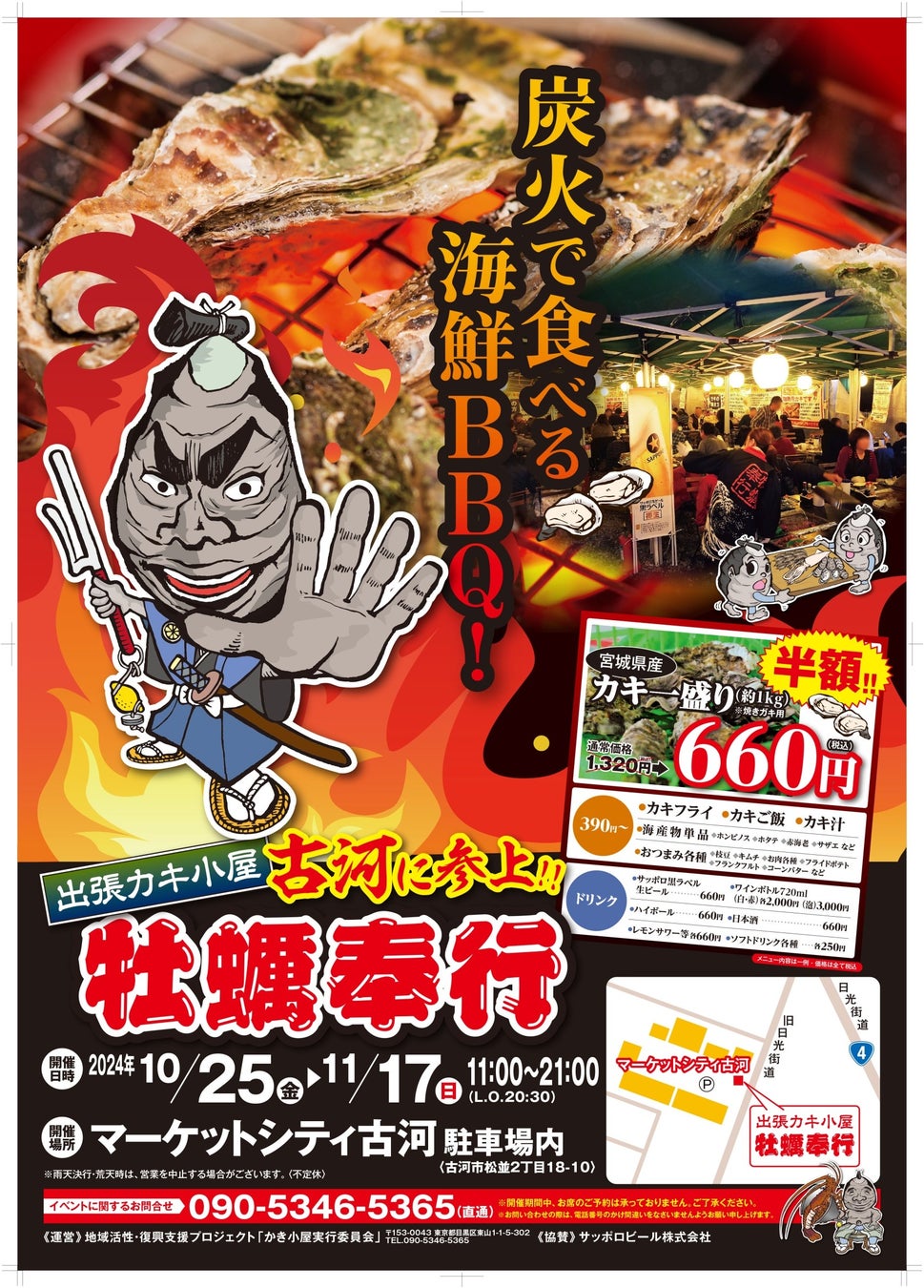 「古河に牡蠣奉行がやってきた!」出張かき小屋が茨城県古河市に出店「地域活性・東北復興支援プロジェクト 出張カキ小屋 牡蠣奉行」がでマーケットシティ古河店で短期出店(10/25-11/17)