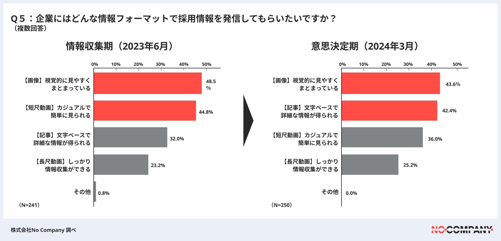 Q5「企業にはどんな情報フォーマットで採用情報を発信してもらいたいですか?(複数可)」の質問では、「情報収集期」、「意思決定期」ともに「情報が視覚的に見やすくまとまっている画像」がトップとなりました。これは、Instagramなどで見られる画像の上に文字を載せたコンテンツのことです。