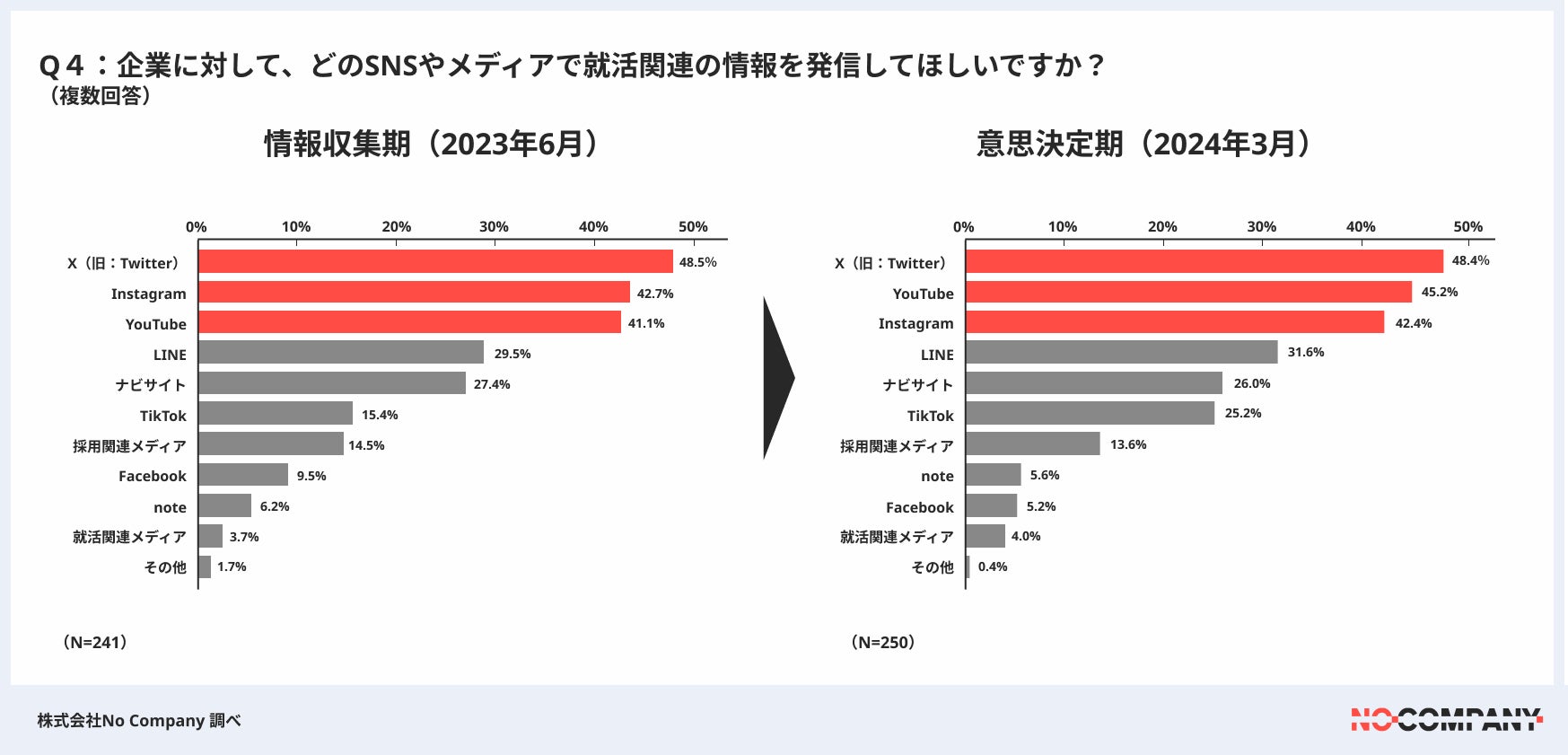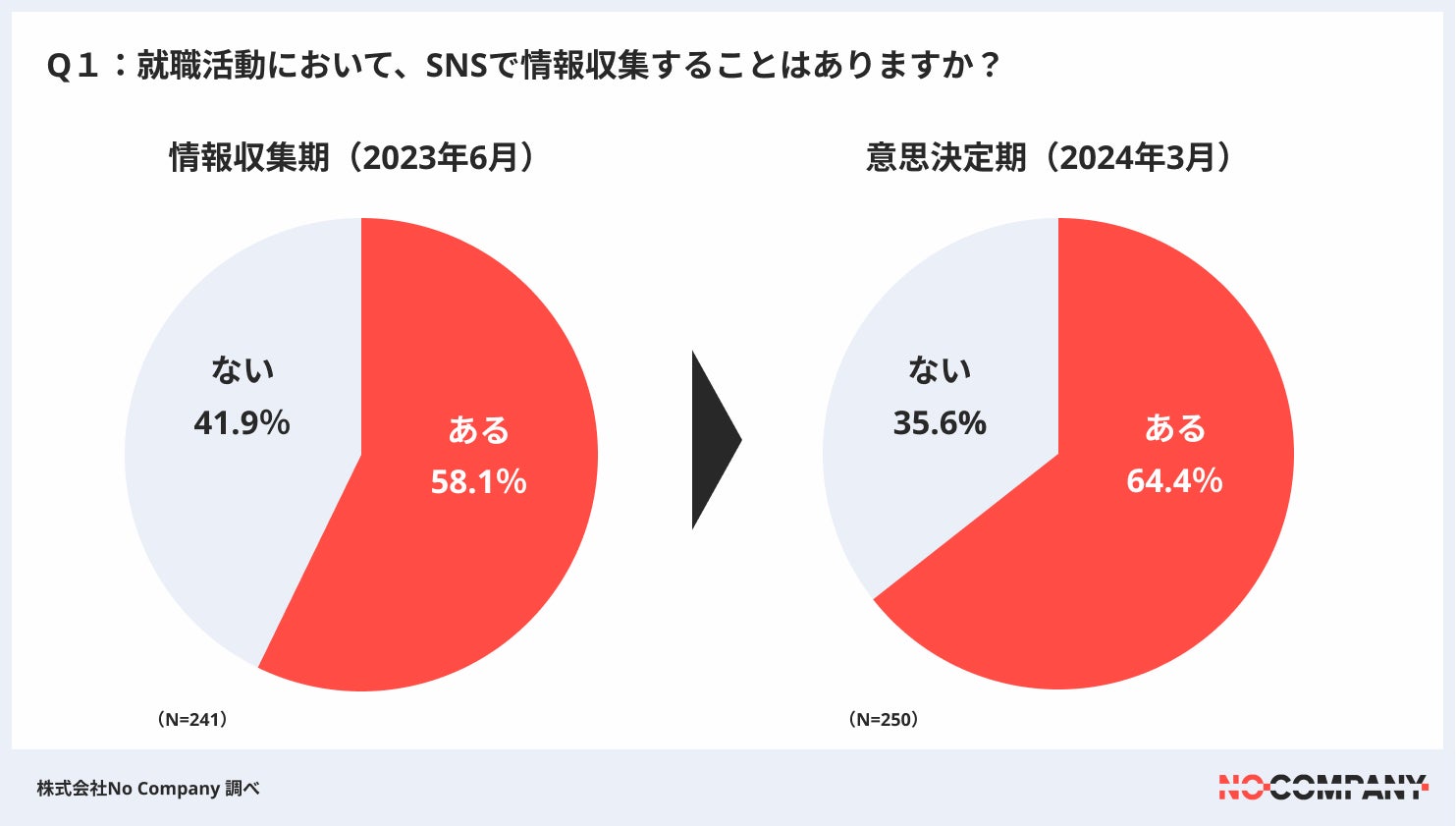 企業の人事部門向けに採用広報(採用マーケティング)支援を行う株式会社No Company(本社:東京都港区、代表取締役:秋山真)は、このたび、25卒就活生向けに採用情報の「情報収集期」(2023年6月)と内定承諾などを行う「意思決定期」(2024年3月)にそれぞれアンケート調査を行い、各時期における就活生のSNS活用実態をまとめました。