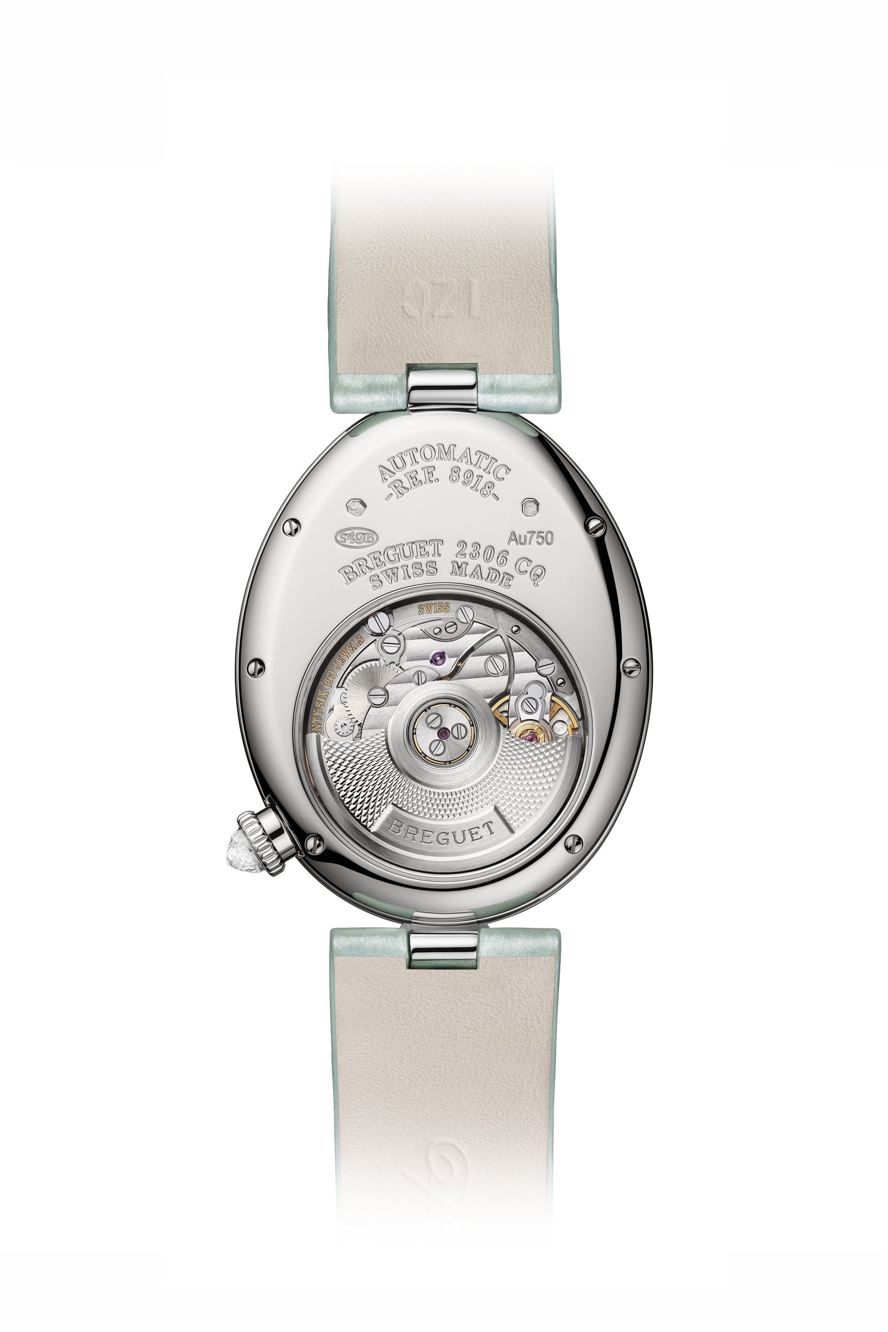 36.5×28.45mmのオーバル型ケースには、45時間のパワーリザーブと191個の部品で構成されるキャリバー537/3の自動巻ムーブメントが搭載されています。このムーブメントは、シリコン製のひげゼンマイおよびインライン・スイスレバー脱進機を備えます。シリコンはさまざまな特性を備えており、腐食耐性や摩耗耐性に優れ、磁場の影響を受けず、時計の精度を向上させます。キャリバーの部品はすべて、見える部品も見えない部品も、ブレゲの伝統に則って手作業で慎重に作られます。ホワイトゴールド製ケースのサファイア・ケースバックからは、プラチナ製ローターとコート・ド・ジュネーブ装飾、ポリッシュ仕上げのネジ、面取りされたムーブメントを眺めることができます。また、ケースの縁には、個別番号が刻まれています。